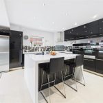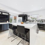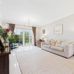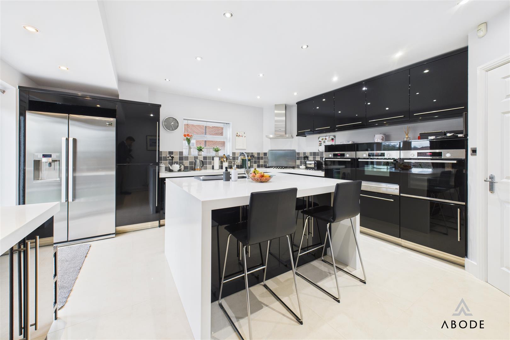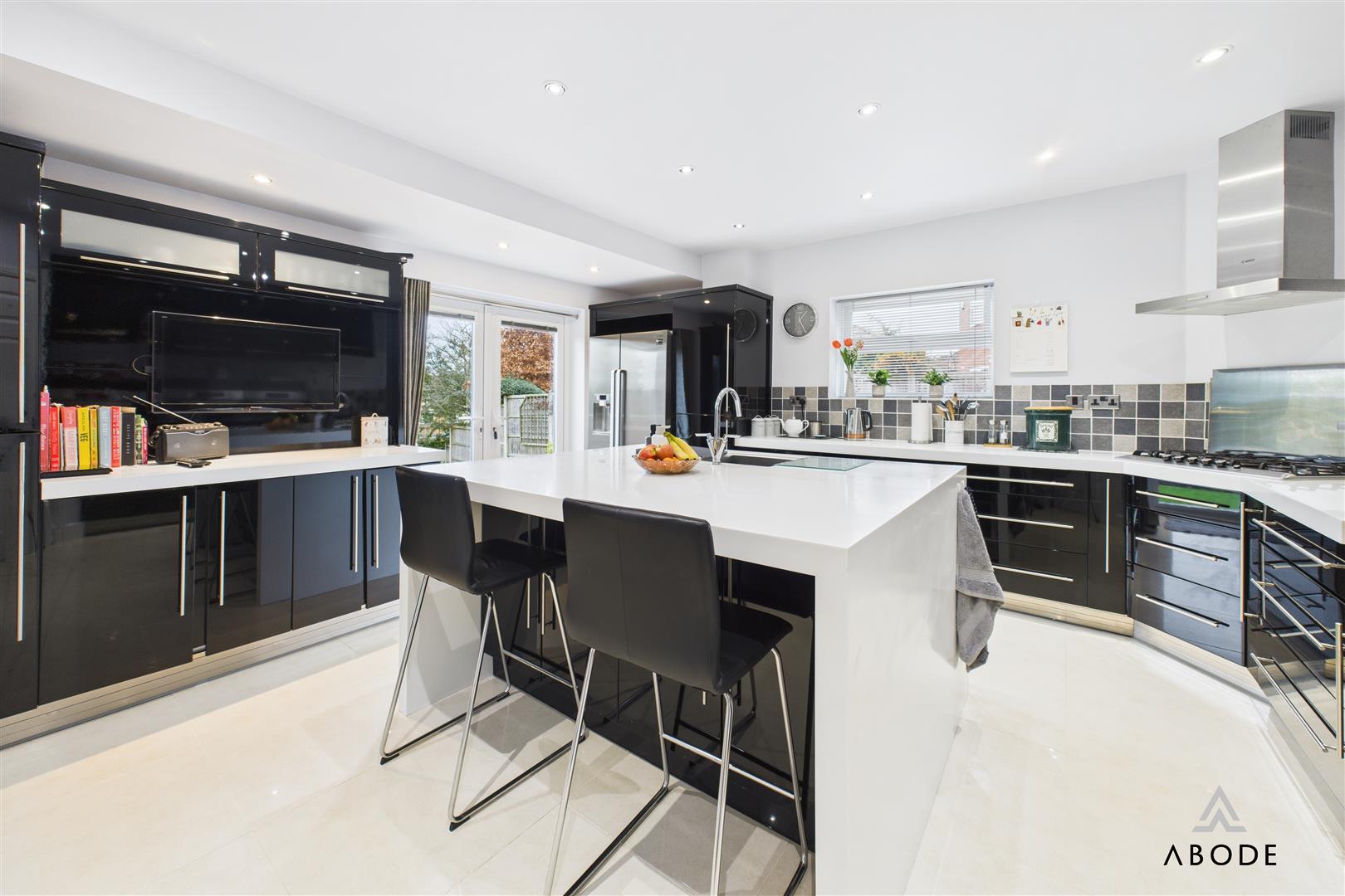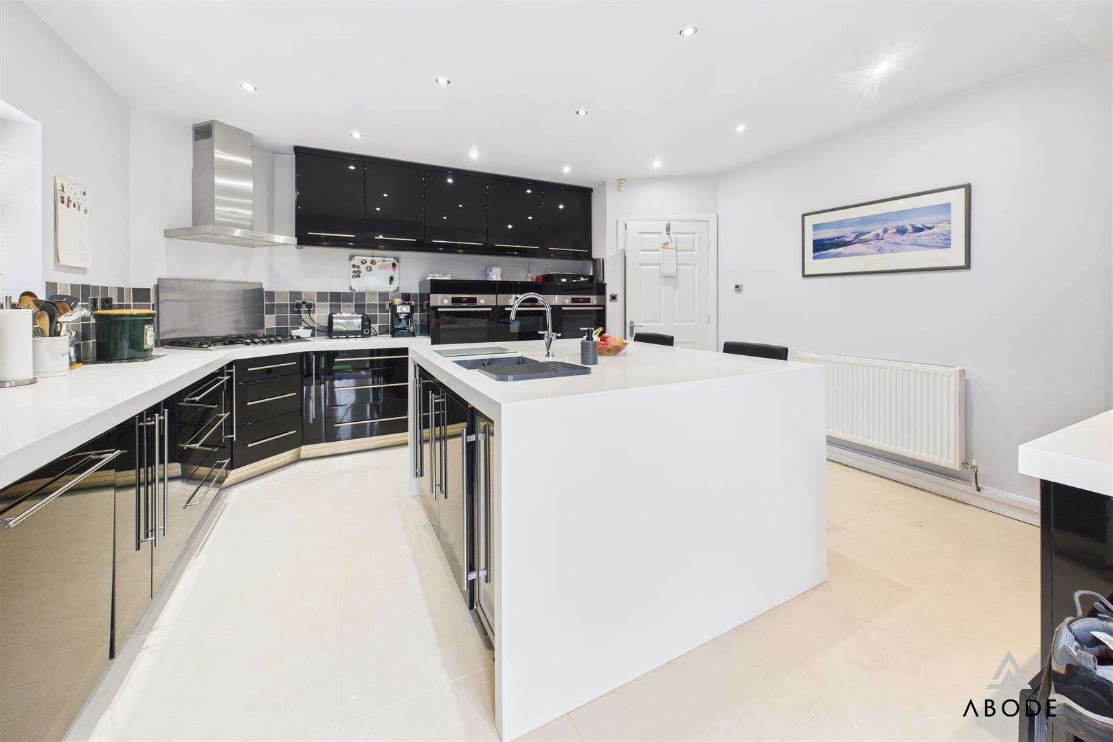 A superb open-plan kitchen and dining area offering direct access to the rear patio through UPVC double-glazed French doors with integrated fitted blinds. A further UPVC triple-glazed window overlooks the side elevation. The kitchen is fitted with a bespoke range of matching base and eye-level units with drop-edged work surfaces and complementary tiled splashbacks. High-quality integrated appliances include double electric ovens with grill and warming plate, a stainless-steel gas hob with matching extractor hood, an integrated dishwasher and two wine coolers. There is space for freestanding under-counter appliances. The room is completed with tiled flooring, ceiling spotlights and a central-heating radiator.