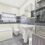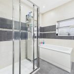 A beautifully finished family bathroom with a UPVC triple-glazed frosted window to the rear elevation. The four-piece suite comprises a low-level WC, a bath with mixer tap, a double shower cubicle with a waterfall shower head and sliding glass door, and a wash hand basin with mixer tap. The room is fully tiled to the walls and floor and includes a chrome heated towel radiator, shaving point, ceiling spotlights, extractor fan and externally controlled underfloor heating.