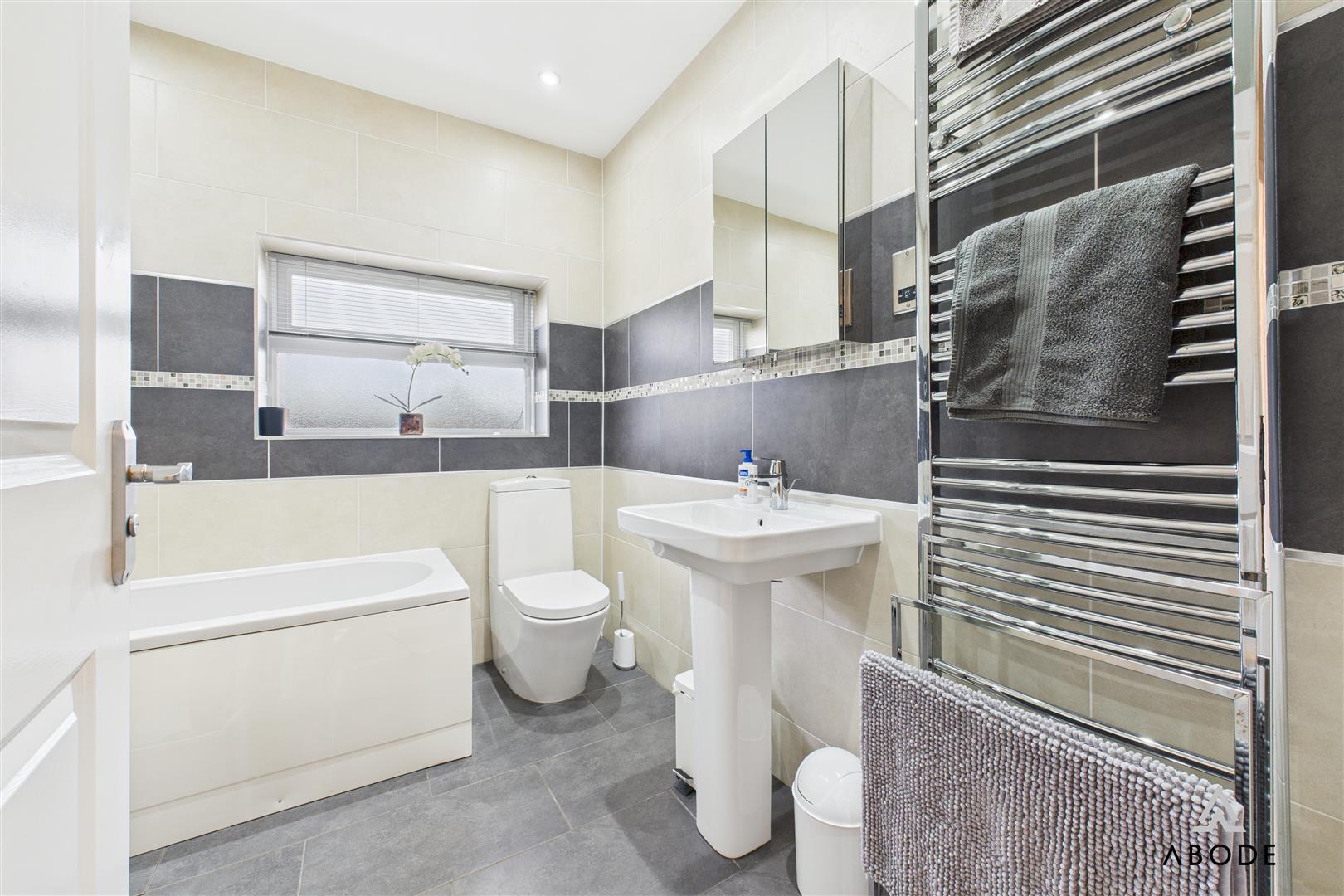 A modern and well-appointed en-suite with a UPVC triple-glazed frosted window to the side. The three-piece suite includes a low-level WC, a wash hand basin with mixer tap and a double walk-in shower with waterfall shower head. Complementary tiling enhances the walls, and the room features a chrome heated towel radiator, shaving point, ceiling spotlights and a built-in extractor fan.