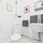 A modern cloakroom featuring tiled flooring, a floating washbasin with mixer tap and tiled splashback, a low-level WC, central-heating radiator and an extractor fan.