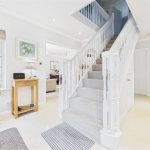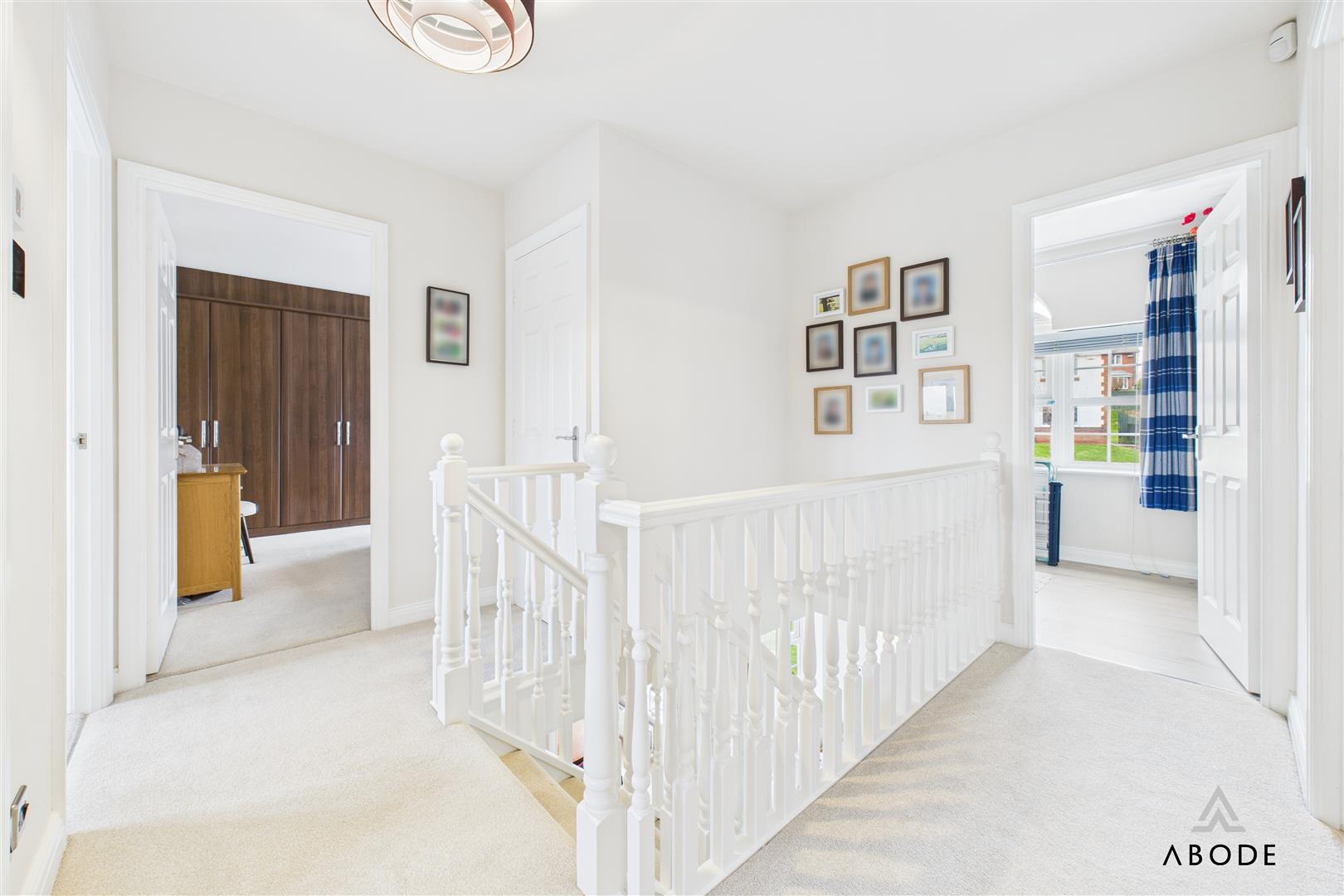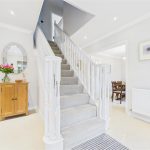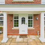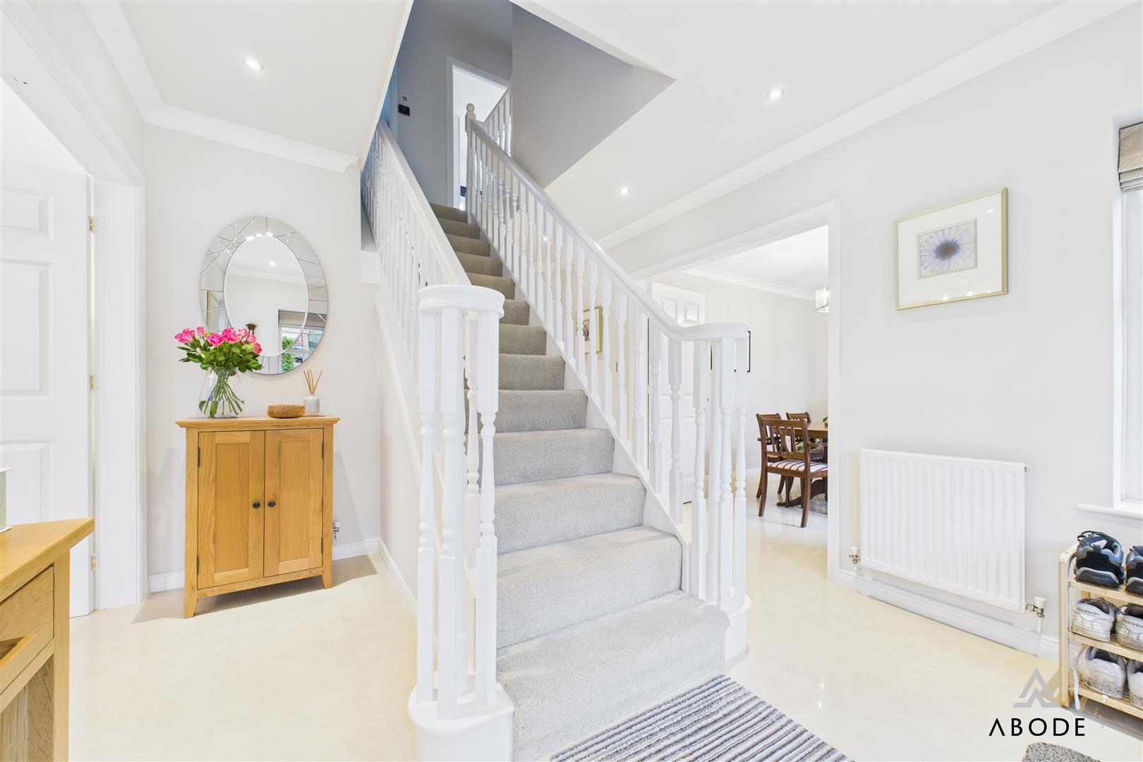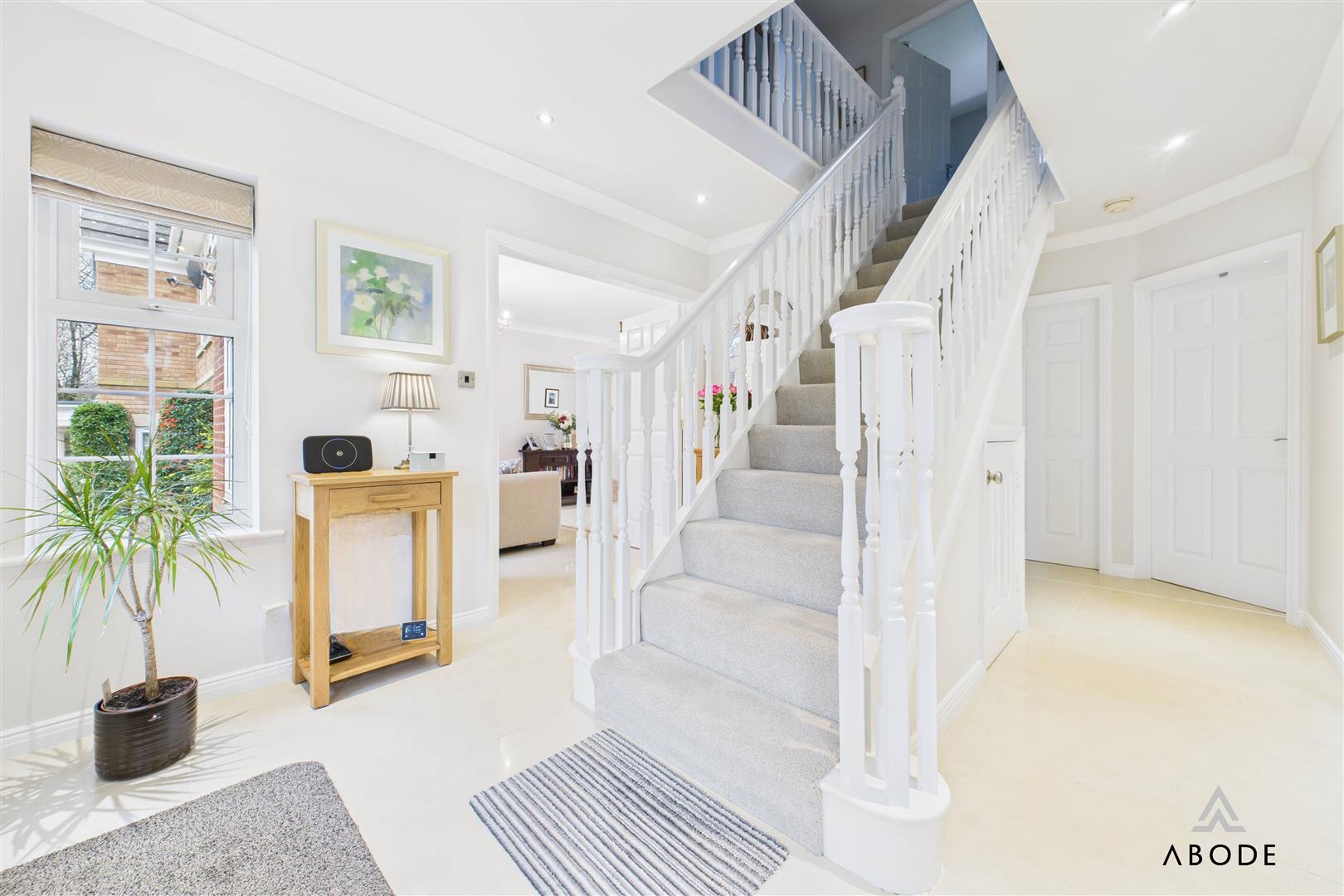A welcoming entrance hall with a balustrade staircase rising to the first-floor landing. The UPVC double-glazed front door is accompanied by four matching glazed side panels, allowing natural light to flow through. The hallway features two central-heating radiators, ceiling spotlights, a smoke alarm, a doorbell chime, a useful under-stairs storage cupboard and a telephone point. Internal doors lead to the ground-floor accommodation.
