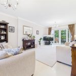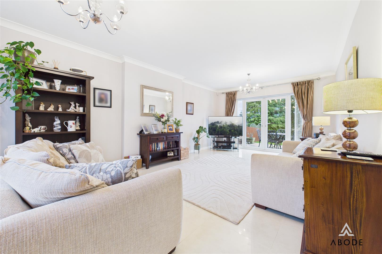 A generous and beautifully presented dual-aspect lounge with complementary tiled flooring. Two bespoke UPVC triple-glazed windows overlook the front elevation, while a set of UPVC double-glazed French doors with adjoining side windows open directly onto the rear patio. The room includes coving to the ceiling, a TV aerial point and two central-heating radiators.