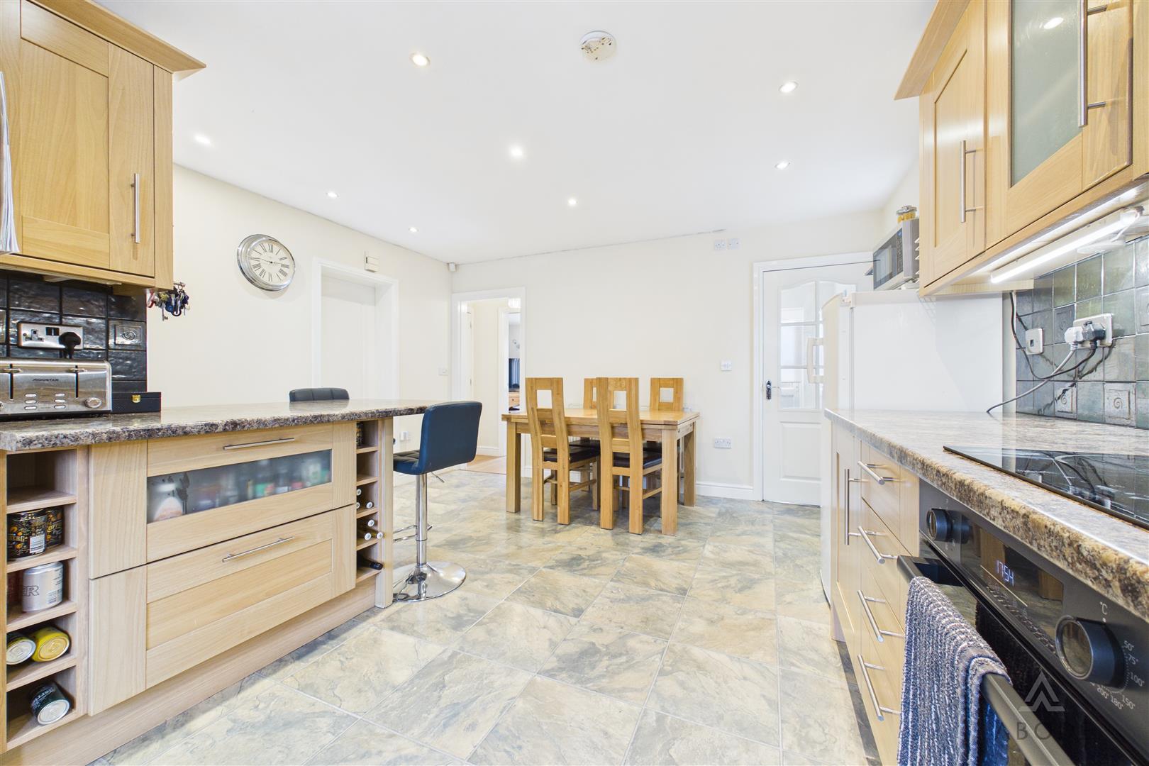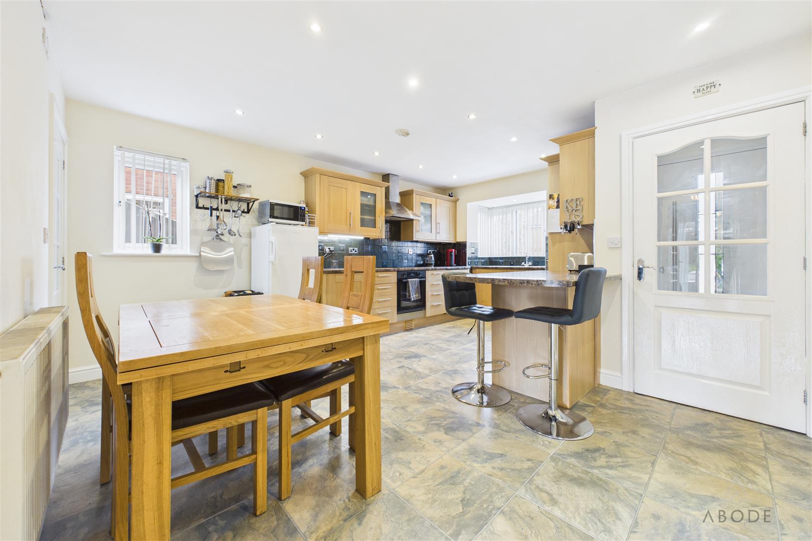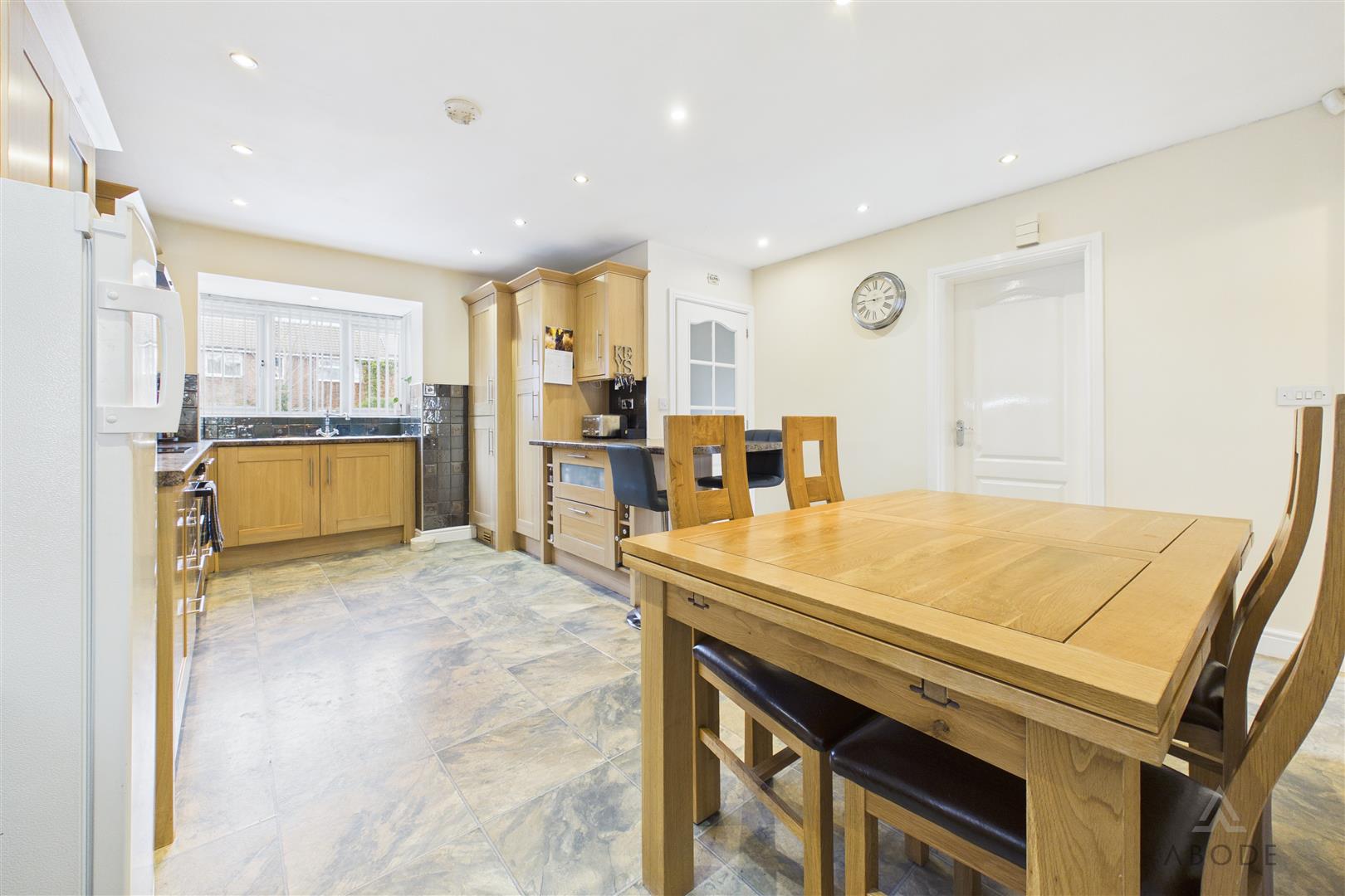 A bright and spacious open-plan living kitchen with a UPVC double-glazed box bay window to the front and an additional window to the side elevation. The kitchen is fitted with a comprehensive range of matching base and eye-level cupboards and drawers, complemented by roll-top work surfaces. Integrated appliances include a one-and-a-half bowl stainless steel sink with mixer tap, four-ring hob with stainless steel extractor hood, oven and grill, integrated fridge, freezer and dishwasher. Additional features include a breakfast bar, space for further freestanding and under-counter appliances, ceiling spotlights, central heating radiator and doorbell chime. Internal doors lead to: