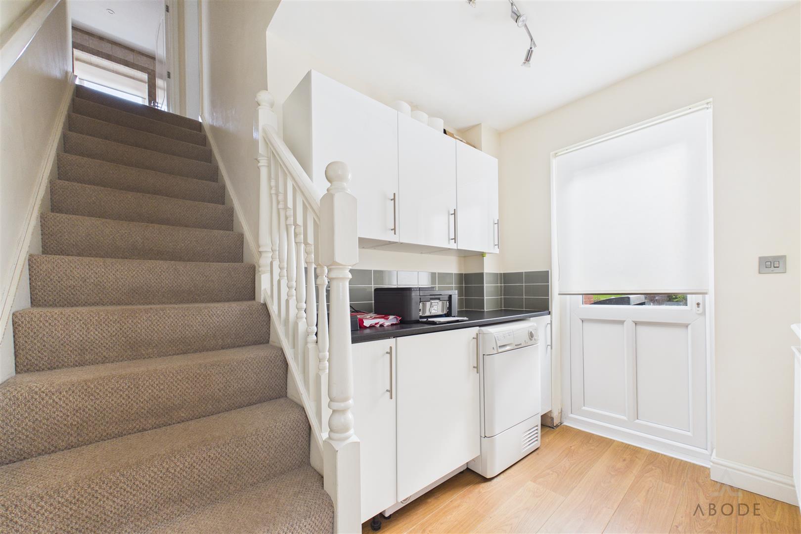 Fitted with matching base and high-level storage cupboards with complementary work surfaces. Plumbing is in place for freestanding under-counter appliances. The room also benefits from a UPVC double-glazed rear access door, side window, central heating radiator and staircase rising to the first floor.