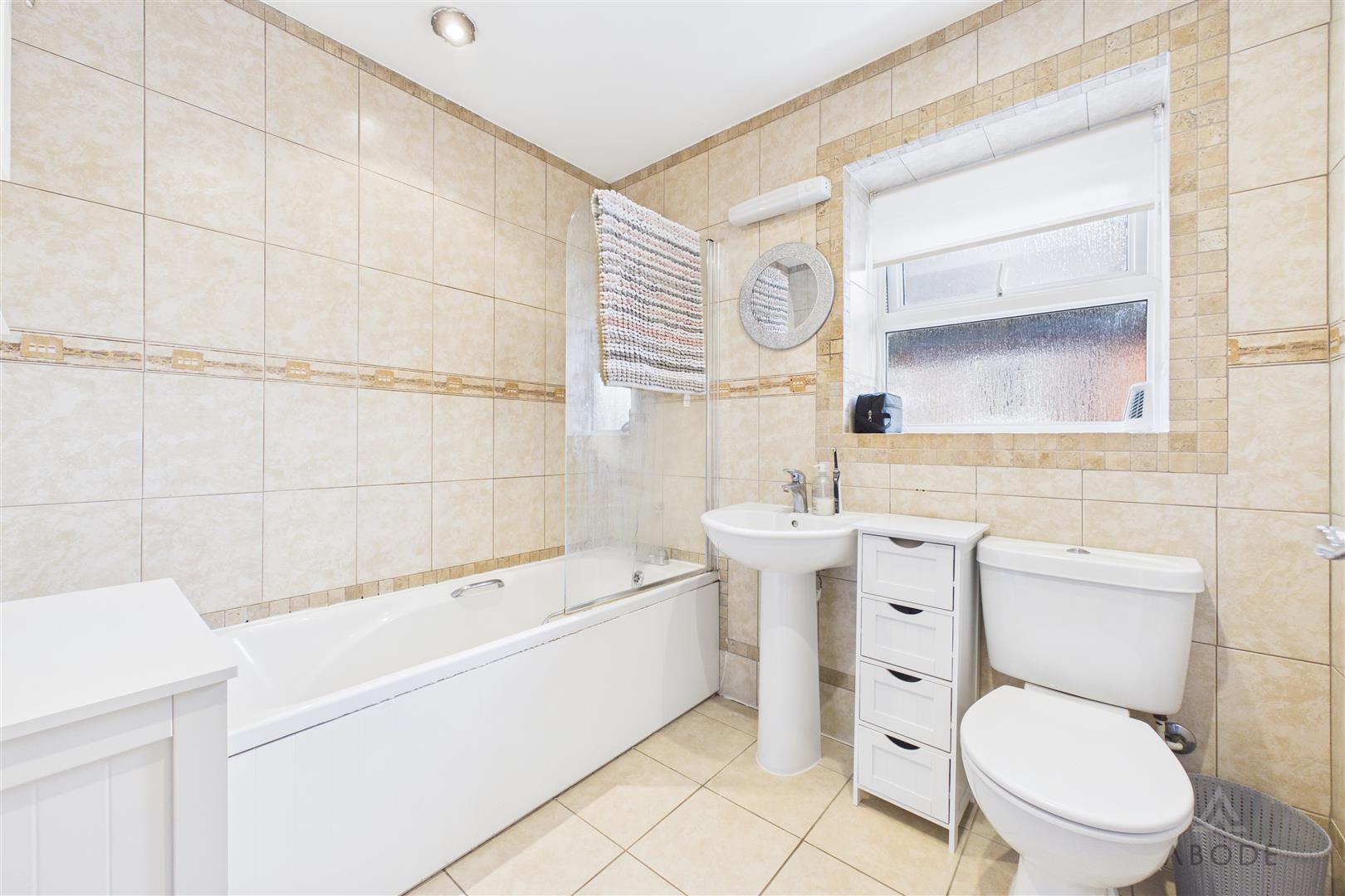 With a UPVC double-glazed frosted window to the side elevation. The three-piece suite comprises a low-level WC with continental flush, pedestal wash basin with mixer tap and bath with shower over and glass screen. Finished with complementary tiling to floor and walls, chrome heated towel radiator, ceiling spotlights and extractor fan.