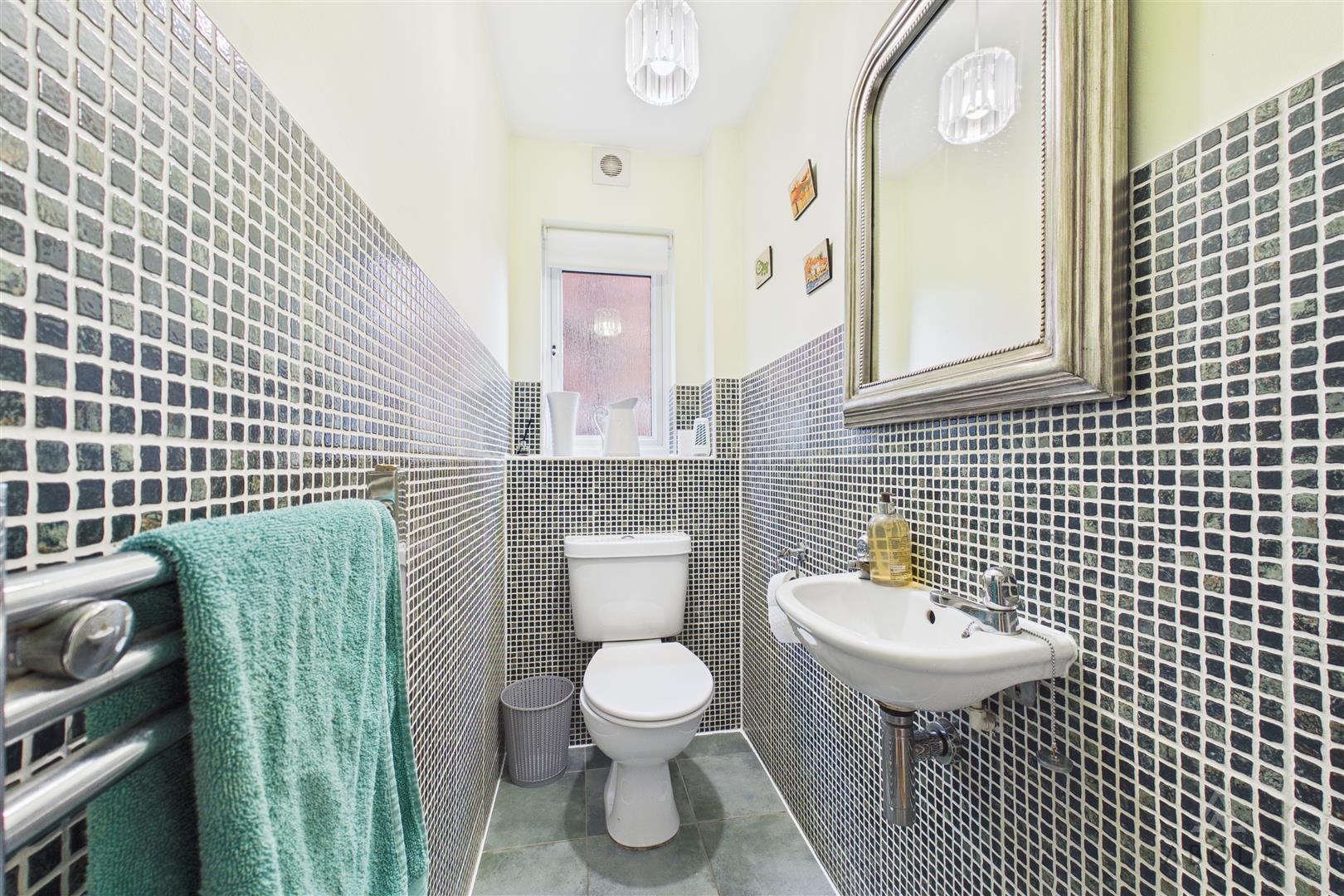 With a UPVC double-glazed frosted window to the side elevation. Fitted with a floating wash hand basin, low-level WC, chrome heated towel radiator, extractor fan and complementary tiling to the floor and part-tiled walls.