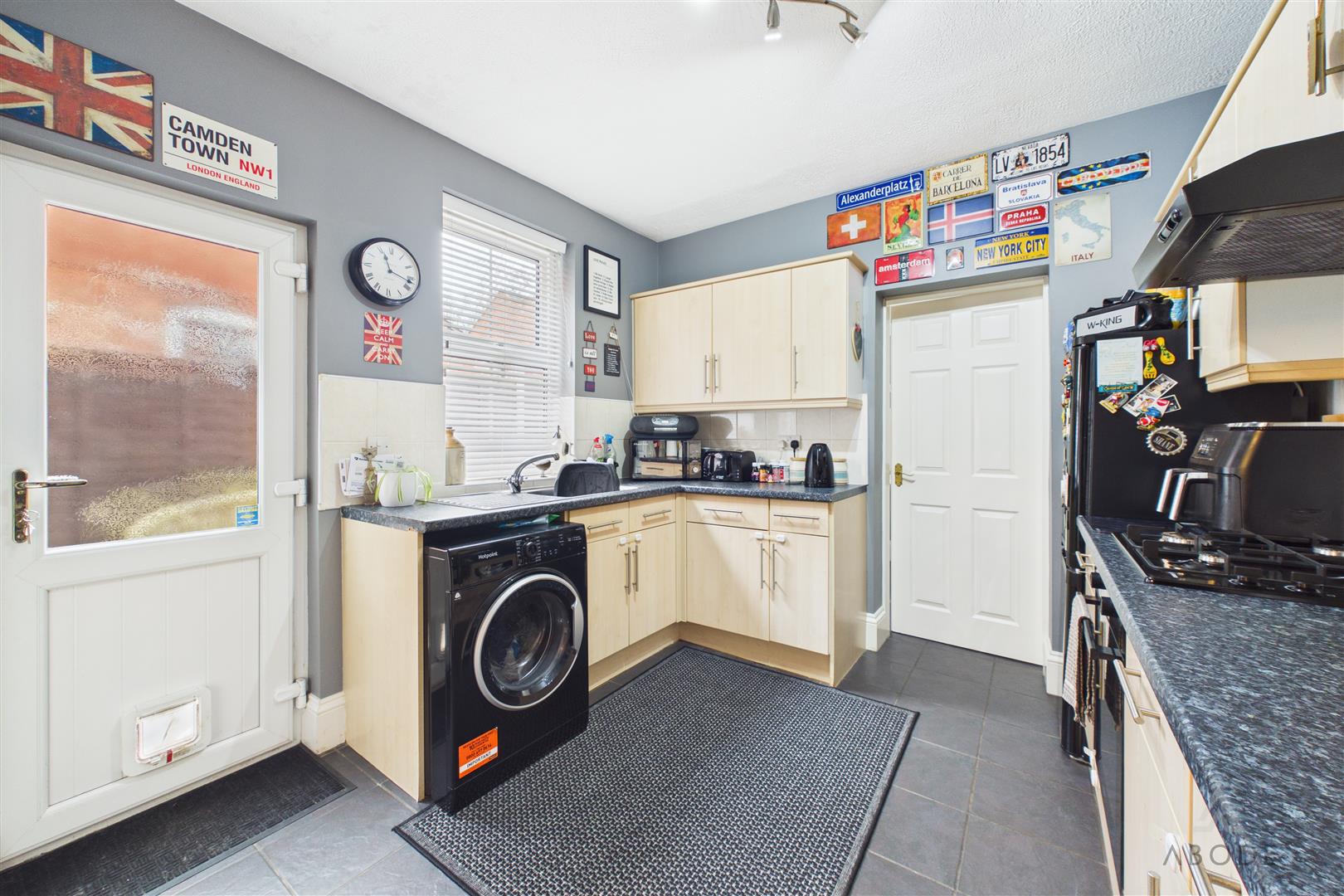 The kitchen is fitted with a range of matching wall and base units with preparation work surfaces over, incorporating a stainless steel sink with drainer, gas hob with extractor above and electric oven below. There is space and plumbing for appliances including a washing machine and fridge freezer, along with tiled flooring and a window and door providing access to the rear garden.