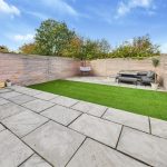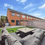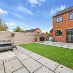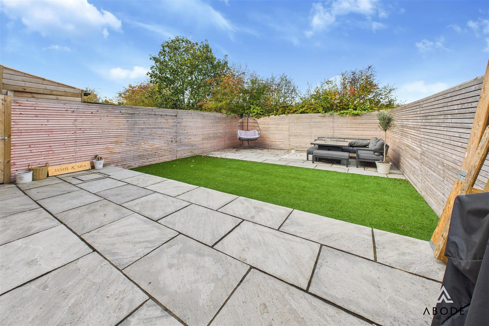 Front lawn and a drive. Enclosed rear gardens with patio areas and a lawn.