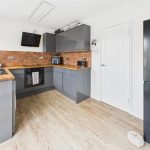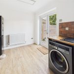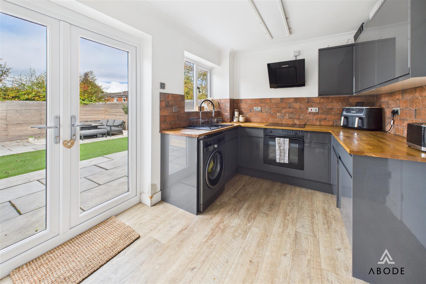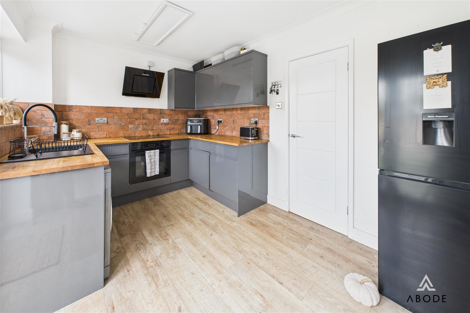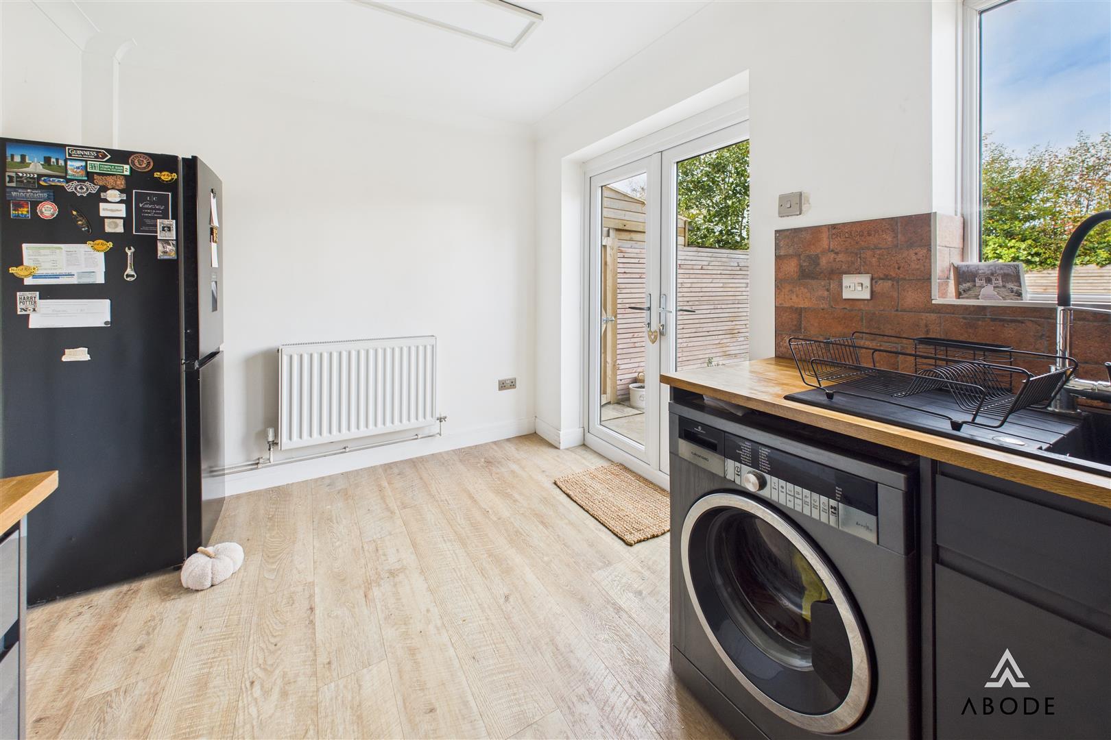 Fitted units with solid wood work surfaces and a sink and drainer unit. Fitted oven and hob with extractor, plumbing and space for a washing machine, radiator and upvc double glazed window and doors onto the garden.