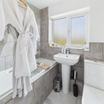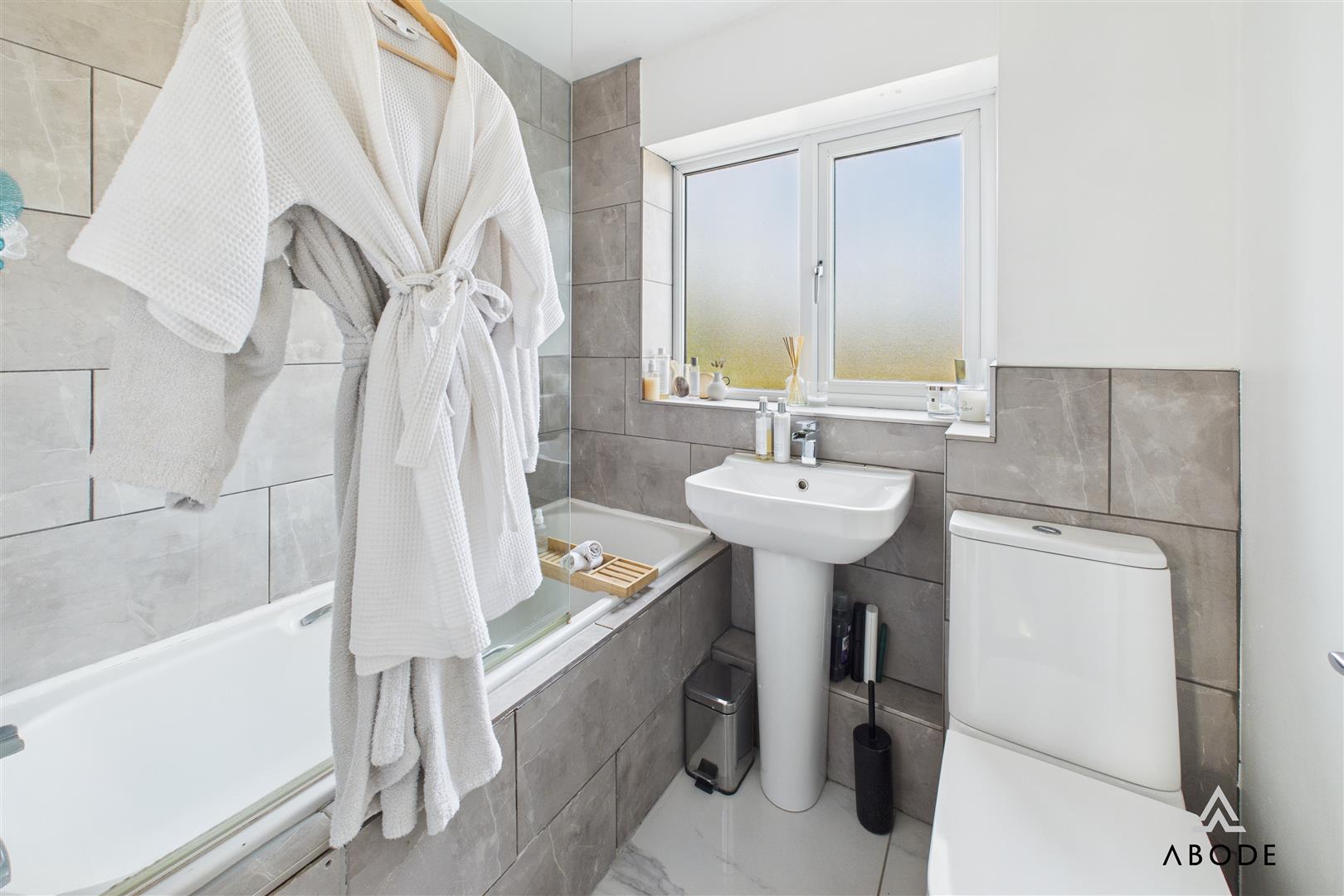 Panel enclosed bath with a shower, low flush wc, wash hand basin, radiator and upvc double glazed window.