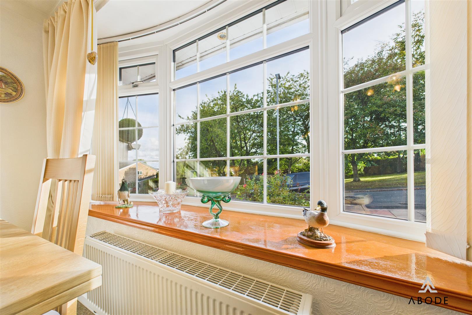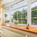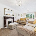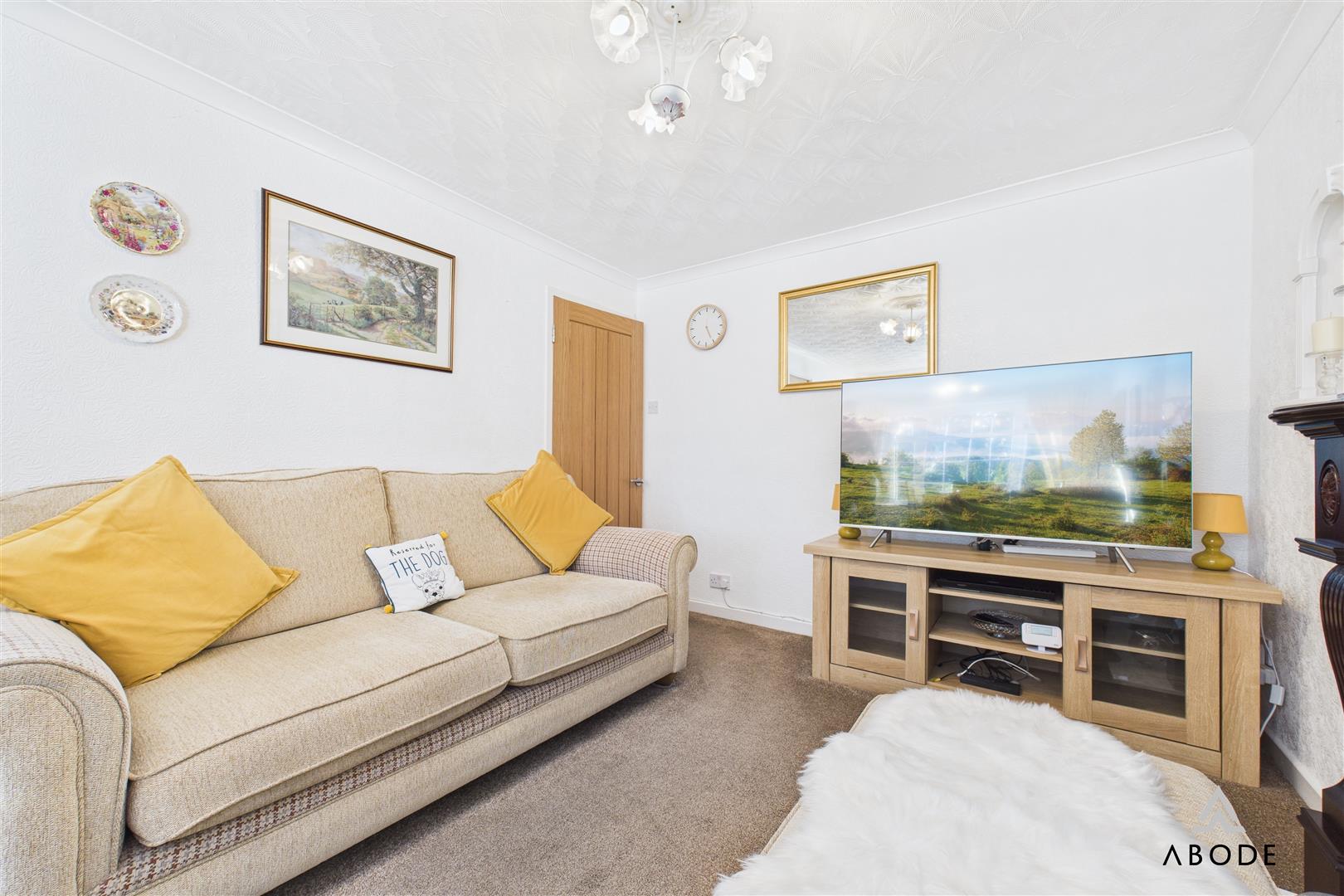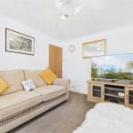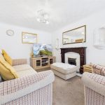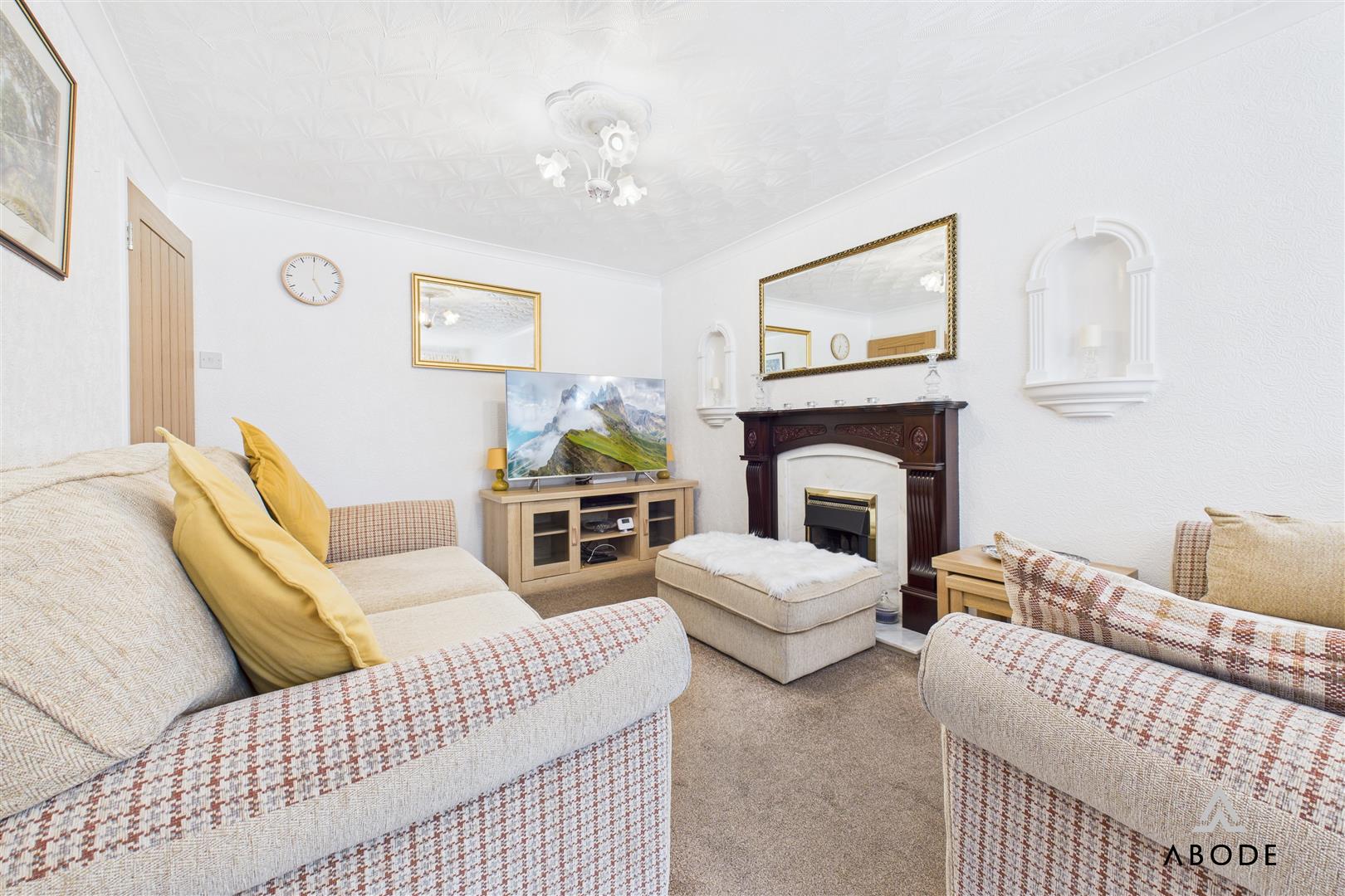 A stylish and inviting reception room, featuring a UPVC double glazed bay window to the front elevation that floods the space with natural light. The focal point of the room is the gas fireplace with a classic timber Adam-style surround. Additional features include twin central heating radiators, TV aerial point, and an internal door leading through to the rest of the home.