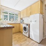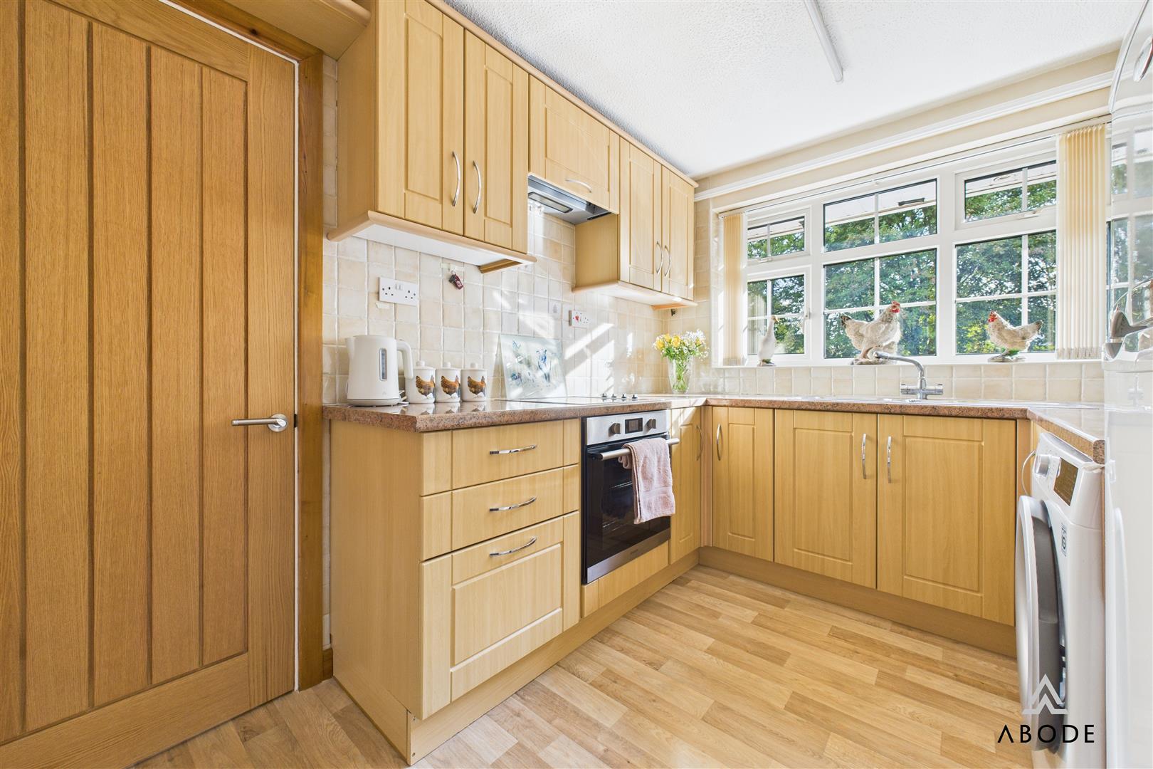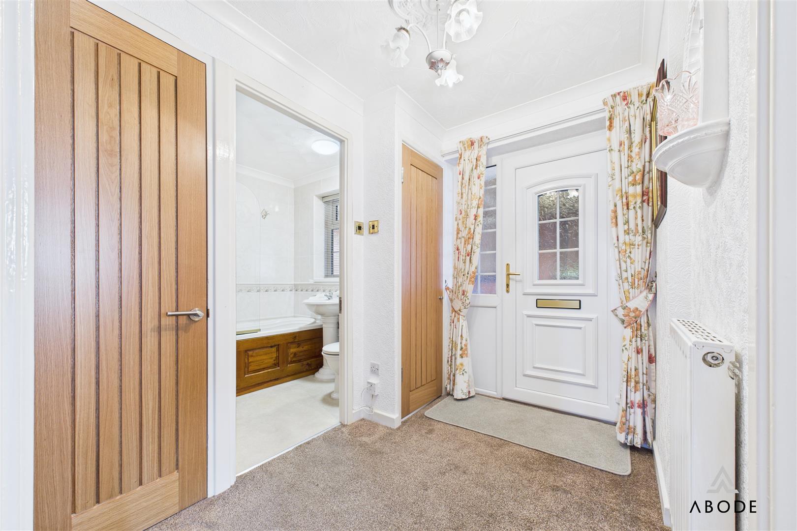 A well-appointed kitchen fitted with a comprehensive range of matching base and eye-level units and drawers, complemented by granite-effect roll-top work surfaces and coordinating tiling. Integrated appliances include a four-ring electric hob with oven, grill, and extractor, along with a one-and-a-half stainless steel sink and drainer with mixer tap. The kitchen also offers plumbing and space for further freestanding and under-counter white goods. A UPVC double glazed front-facing window and frosted side entry door ensure the room feels bright and airy. Further features include a central heating radiator, telephone point, and a useful pantry cupboard housing the Worcester Bosch central heating combination boiler.