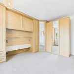 A spacious double bedroom with a UPVC double glazed rear window, central heating radiator, and TV aerial point. The room benefits from a comprehensive range of built-in storage including wardrobes, overhead cupboards, over-bed storage, drawers, hanging rails, shelving, and soft-close LED-lit overhead cupboards.