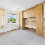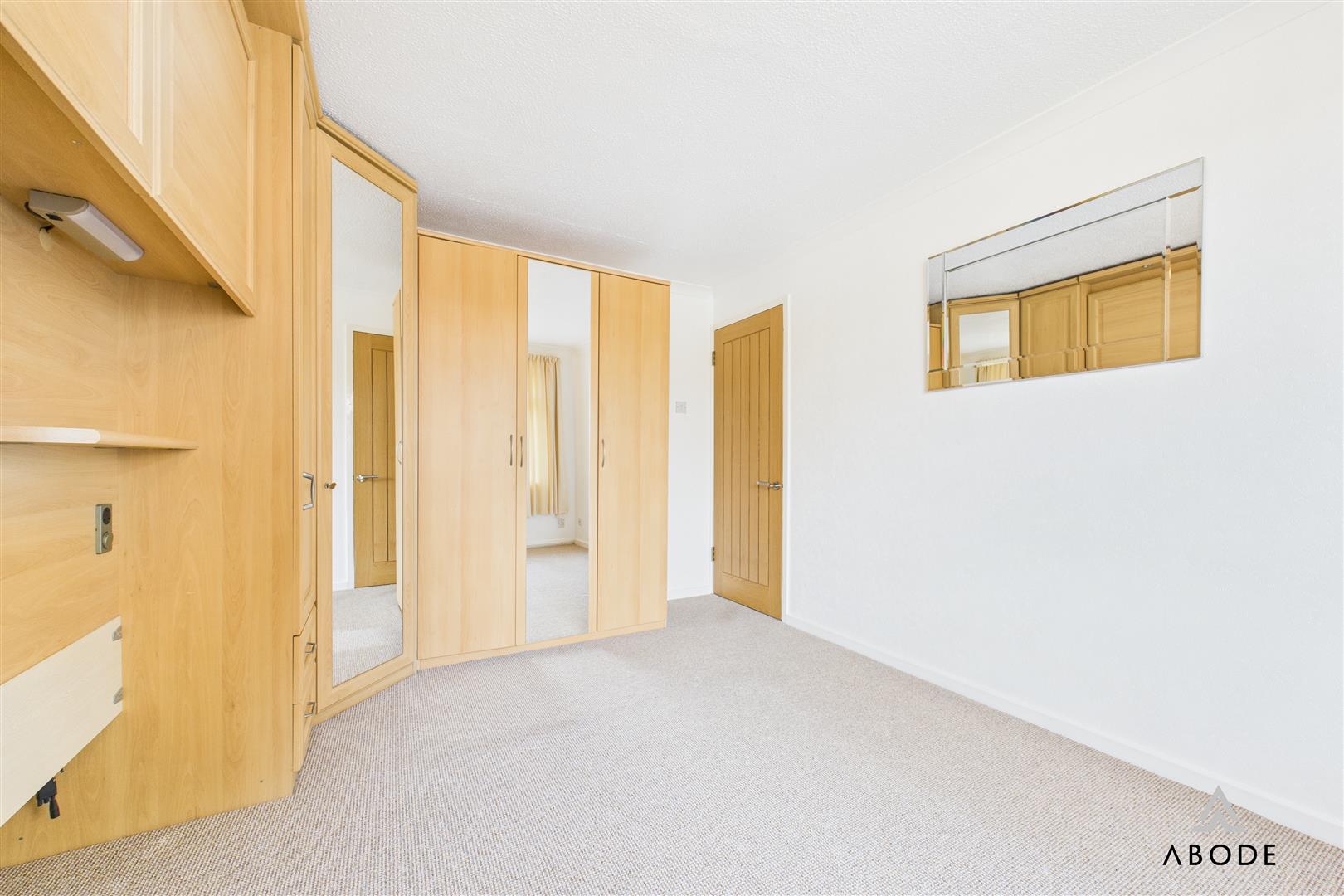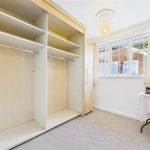 A well-proportioned second bedroom featuring a UPVC double glazed rear window, central heating radiator, and built-in wardrobes with hanging rails and shelving.