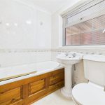 A modern family bathroom with a UPVC double glazed frosted window to the side elevation. The suite comprises a low-level WC, pedestal wash hand basin, and bath with glass screen and electric shower over. Finished with complementary wall tiling and central heating radiator.