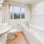 Panel enclosed bath with a shower, low WC, wash hand basin, fitted storage cupboards, UPVC double glaze window and a ladder style radiator.