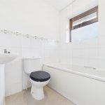 WC, wash hand basin and bath with shower over and glass shower screen. UPVC double glazed window to the rear elevation, central heating radiator and partially tiled walls.