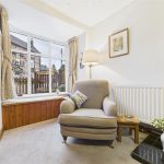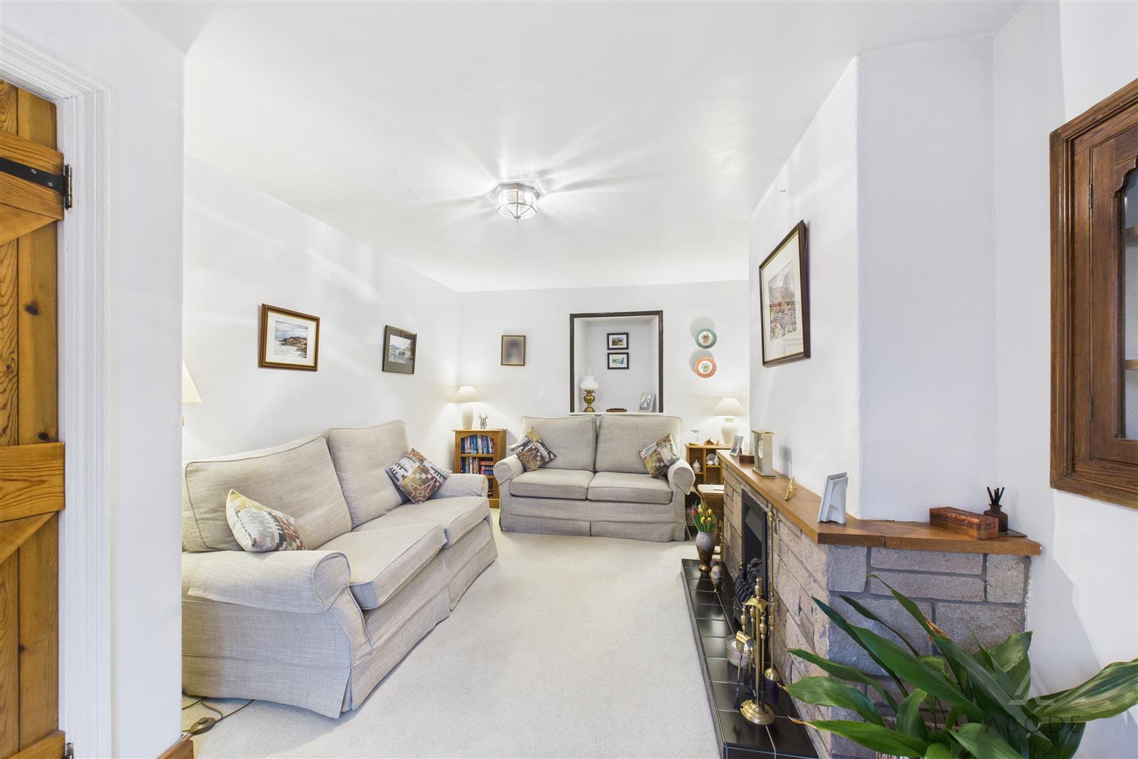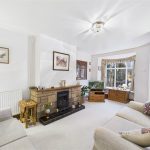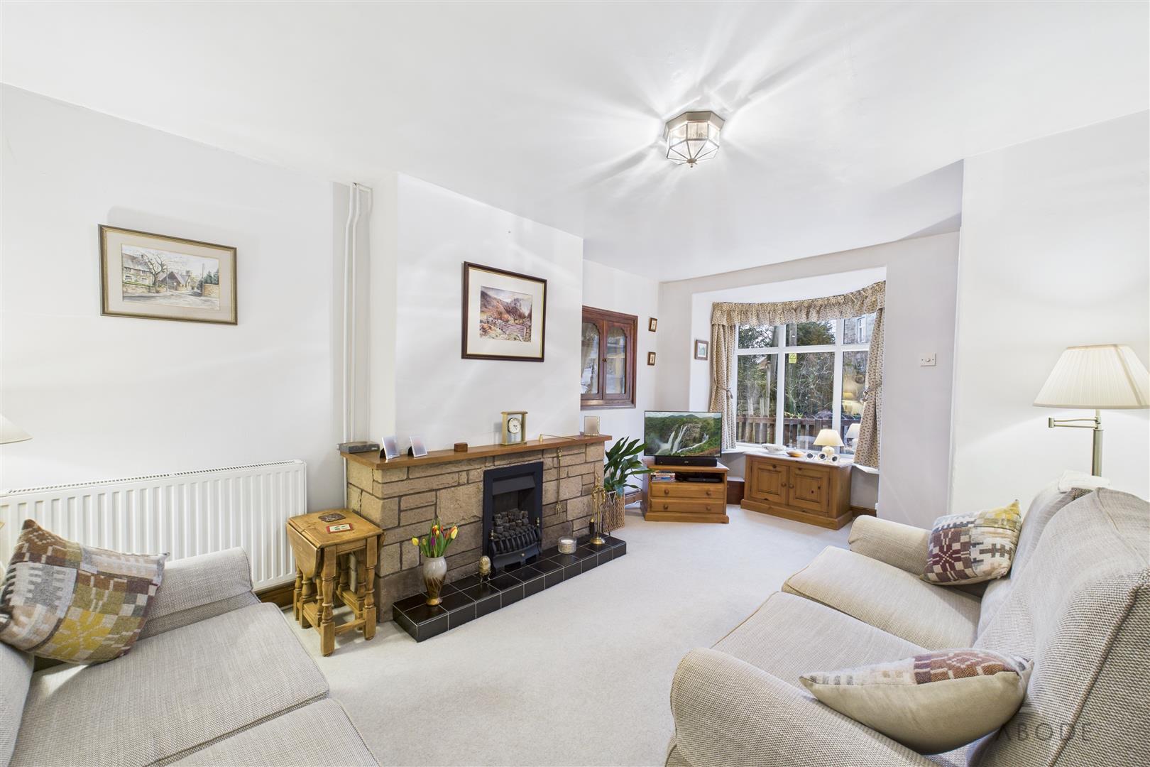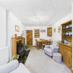 UPVC double glazed bay window with seating, central heating radiator, corner eye level display unit, feature fireplace with tiled hearth and surround.