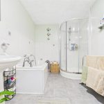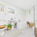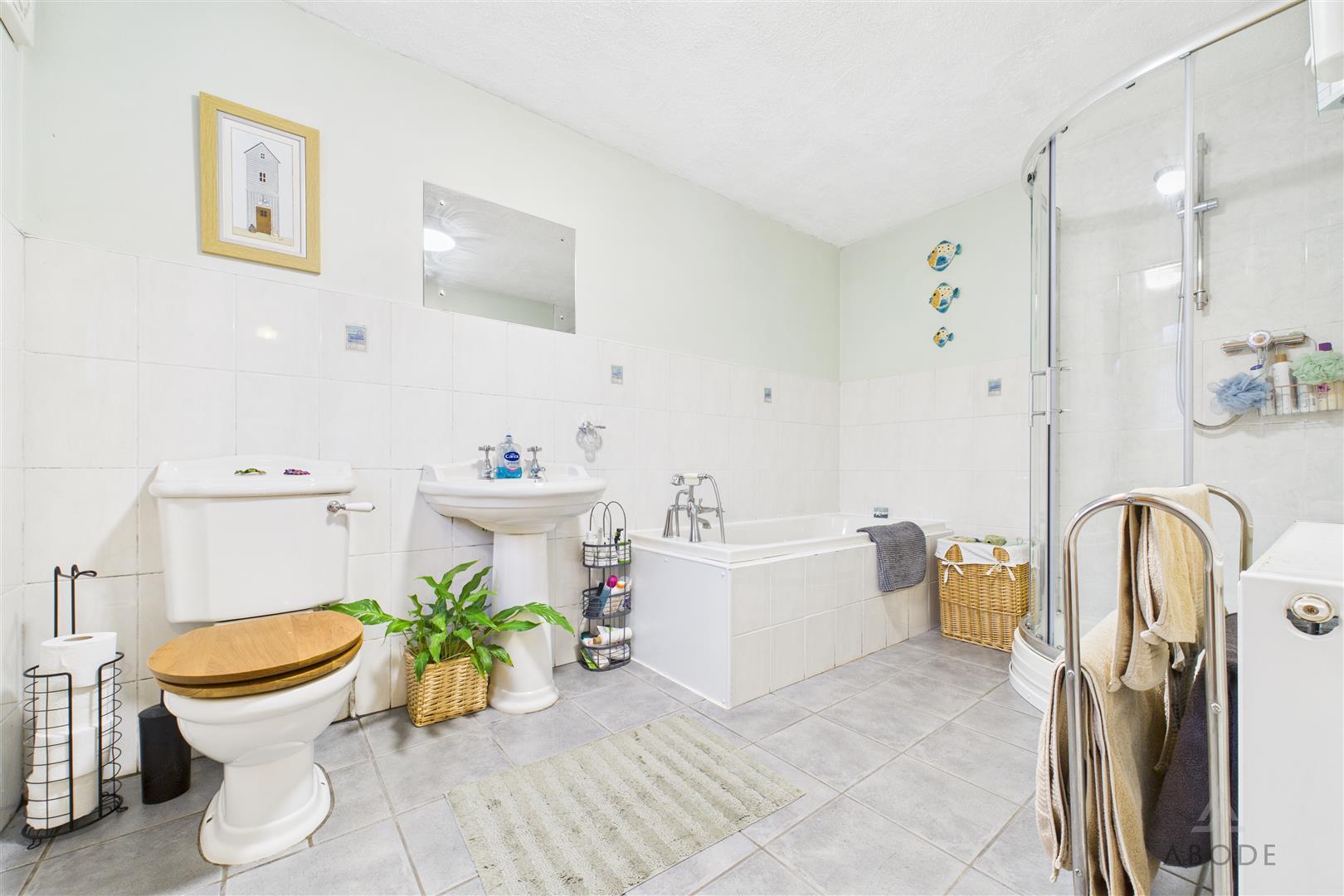 WC, wash hand basin, bath with hand held shower and freestanding corner shower cubicle. Central heating radiator, tiled flooring and partially tiled walls, UPVC double glazed window to the rear elevation.