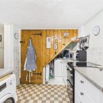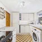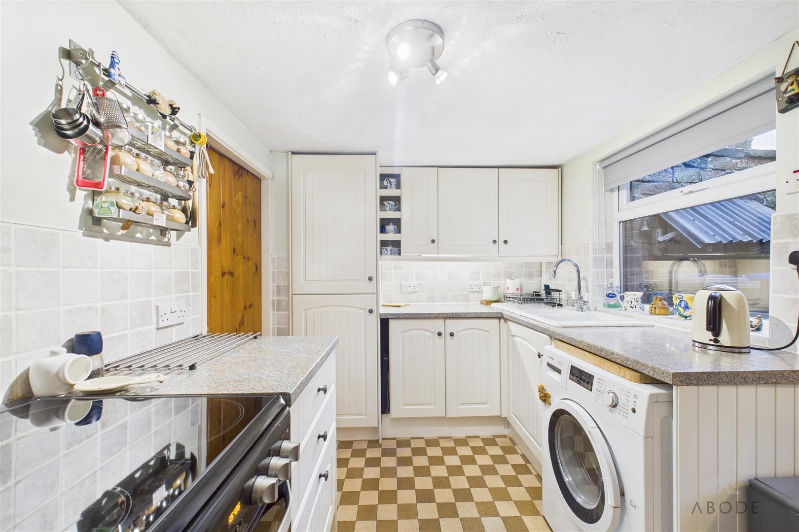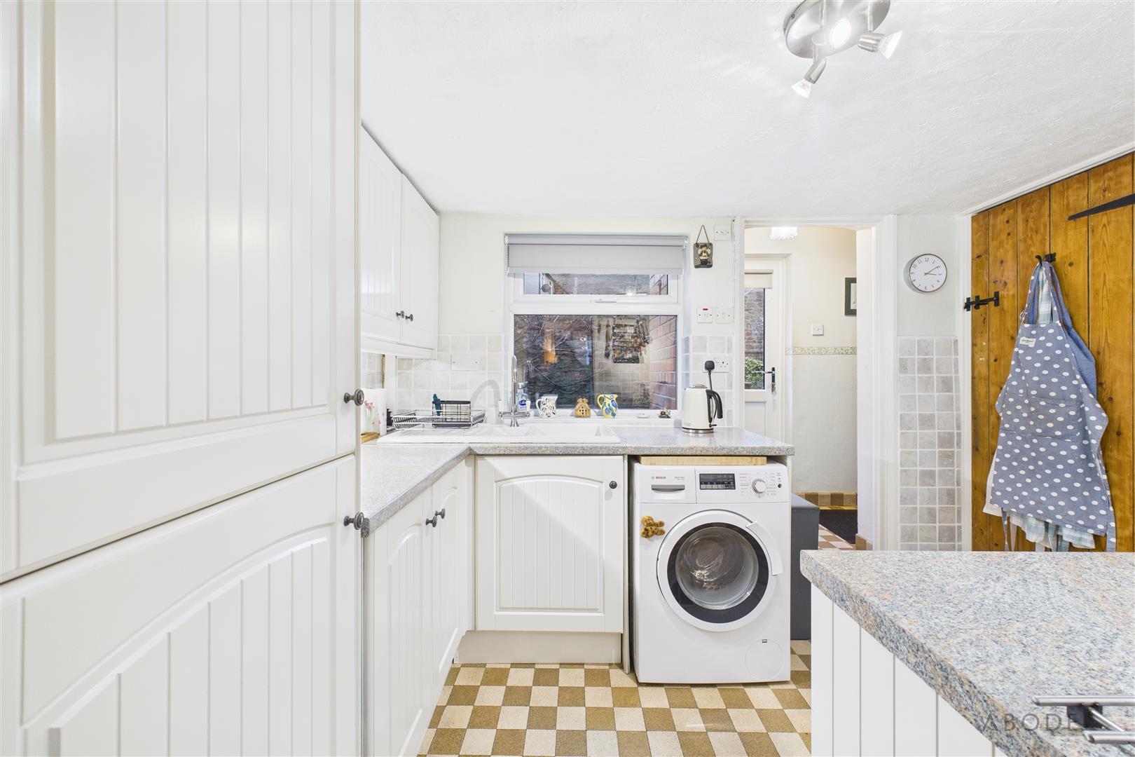 Base and eye level units with complimentary worktops, ceramic one and a half bowl sink with draining board, integrated fridge freezer, space and plumbing for a washing machine and cooker. Central heating radiator, tiled flooring, UPVC double glazed window to the rear elevation, tiled splash back.