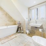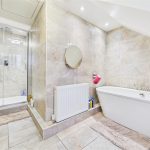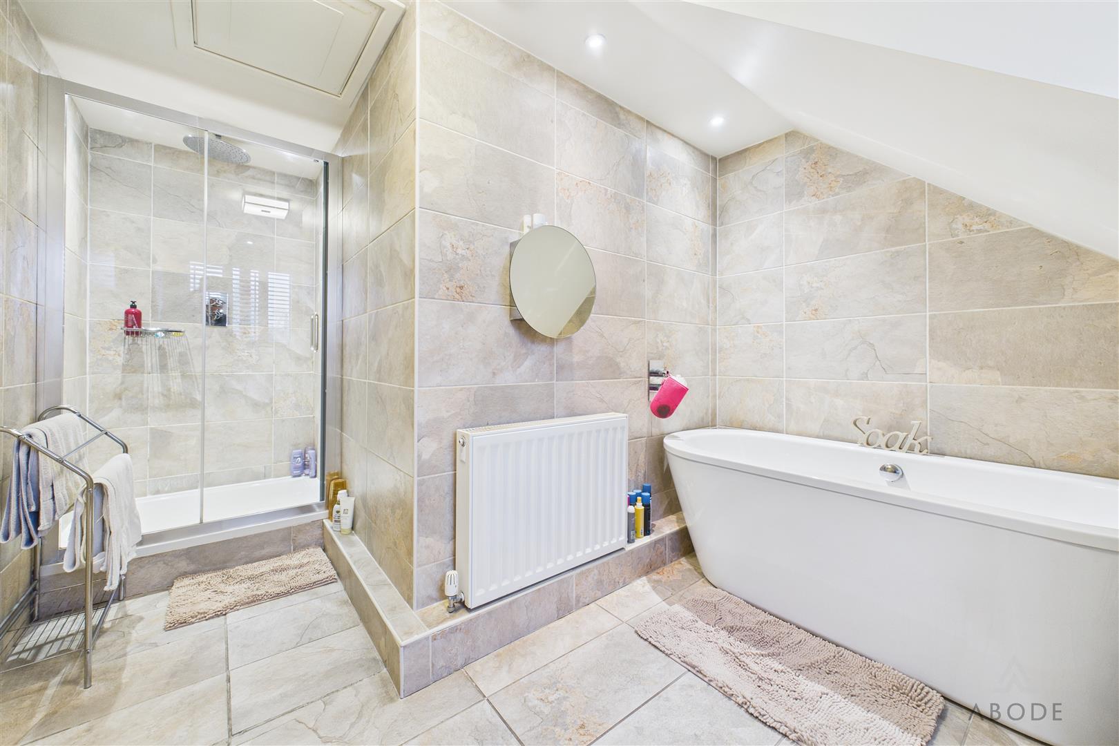 With a UPVC double-glazed window to the front elevation with built-in shutter blinds. Four-piece suite comprising freestanding bath with mixer tap, floating wash basin with mixer tap, double shower cubicle with waterfall showerhead, and low-level WC. Finished with complementary wall tiling, ceiling spotlighting, extractor fan, shaving point, central heating radiator, and loft access.