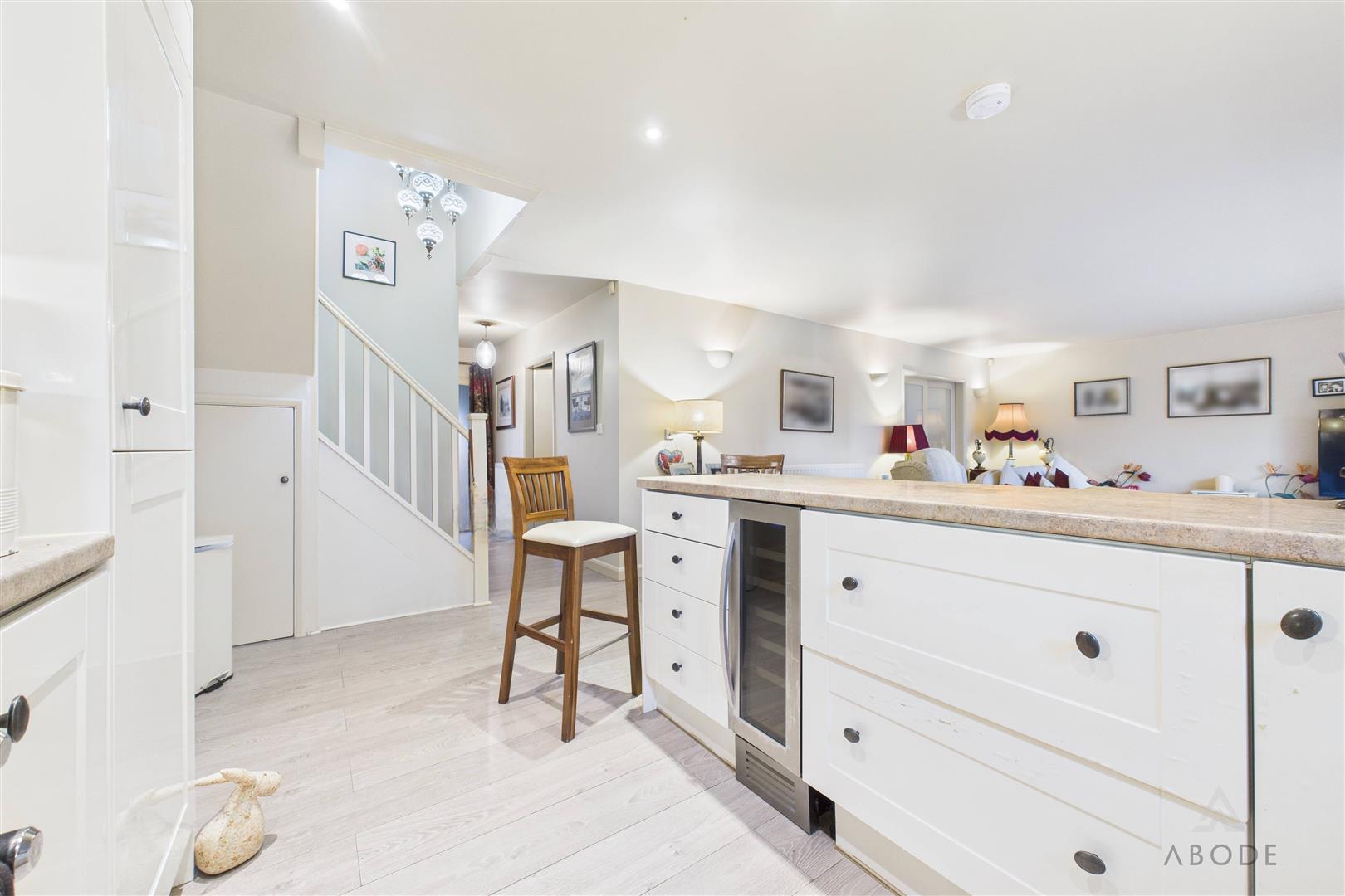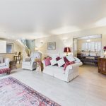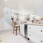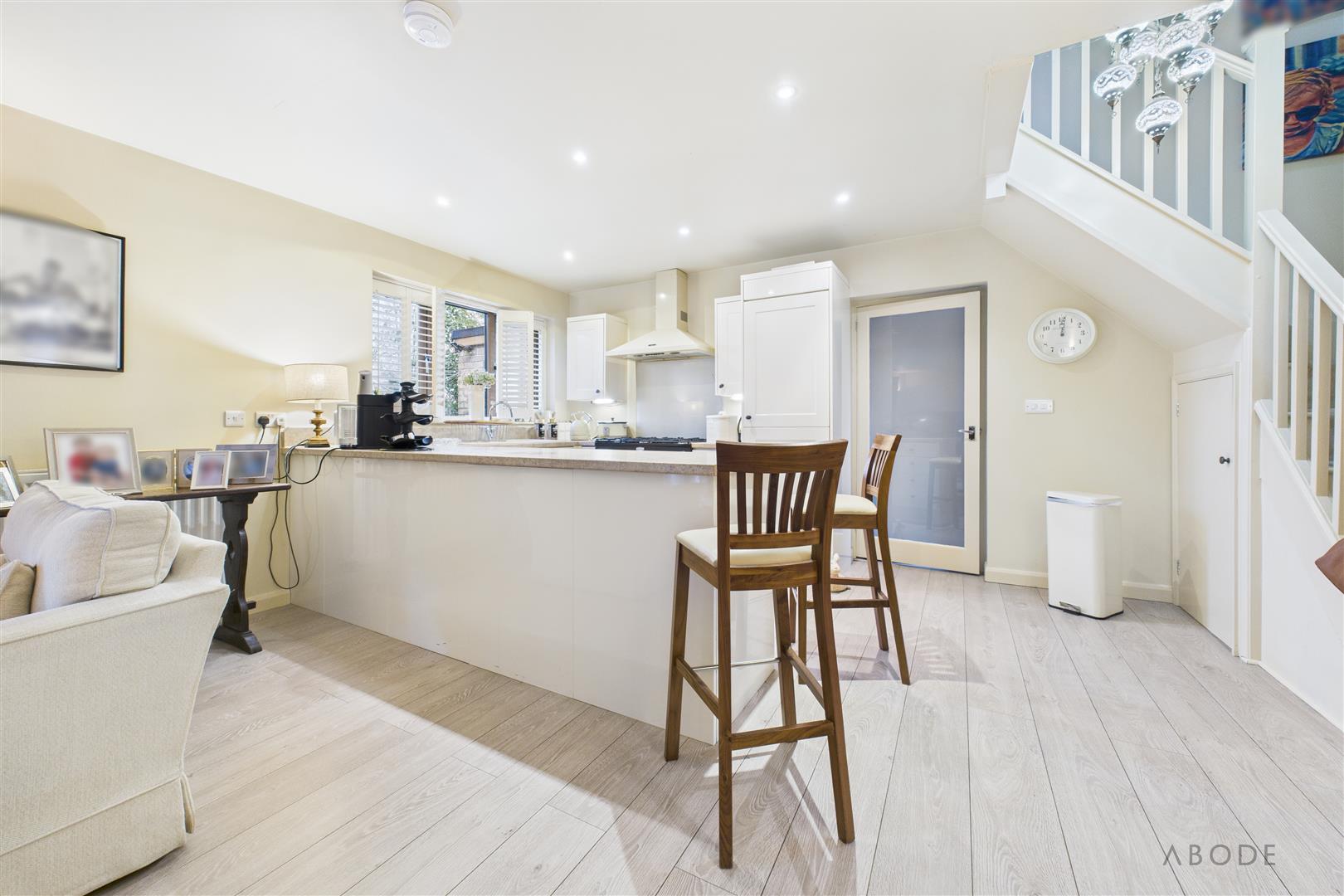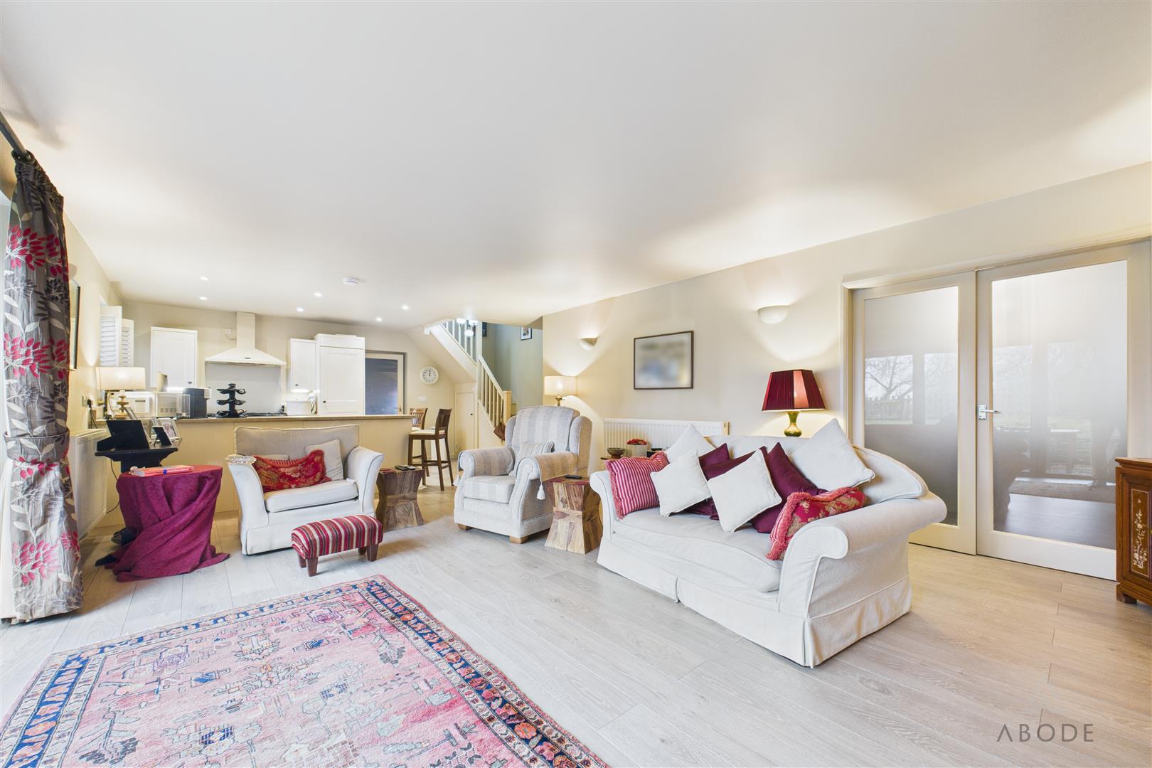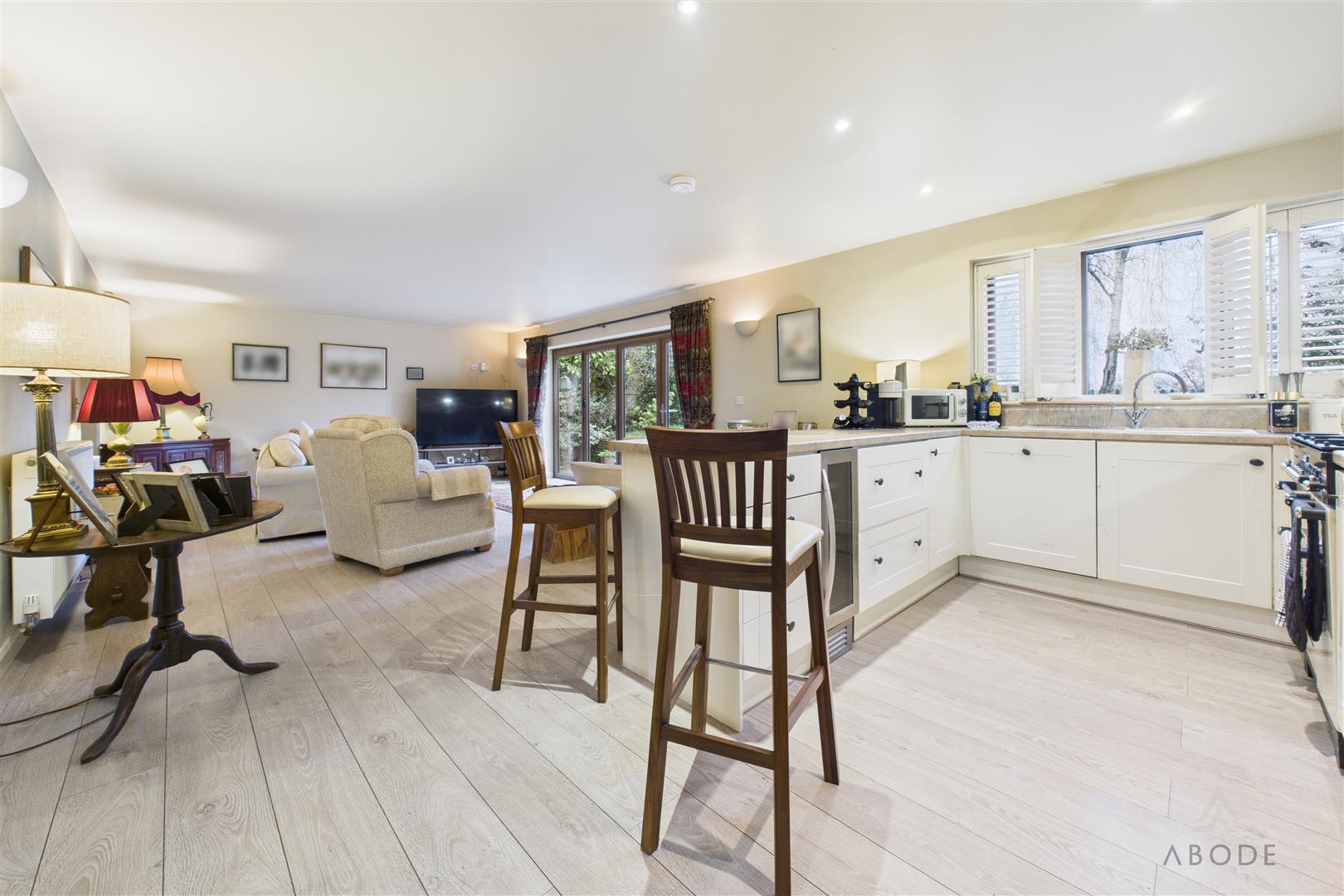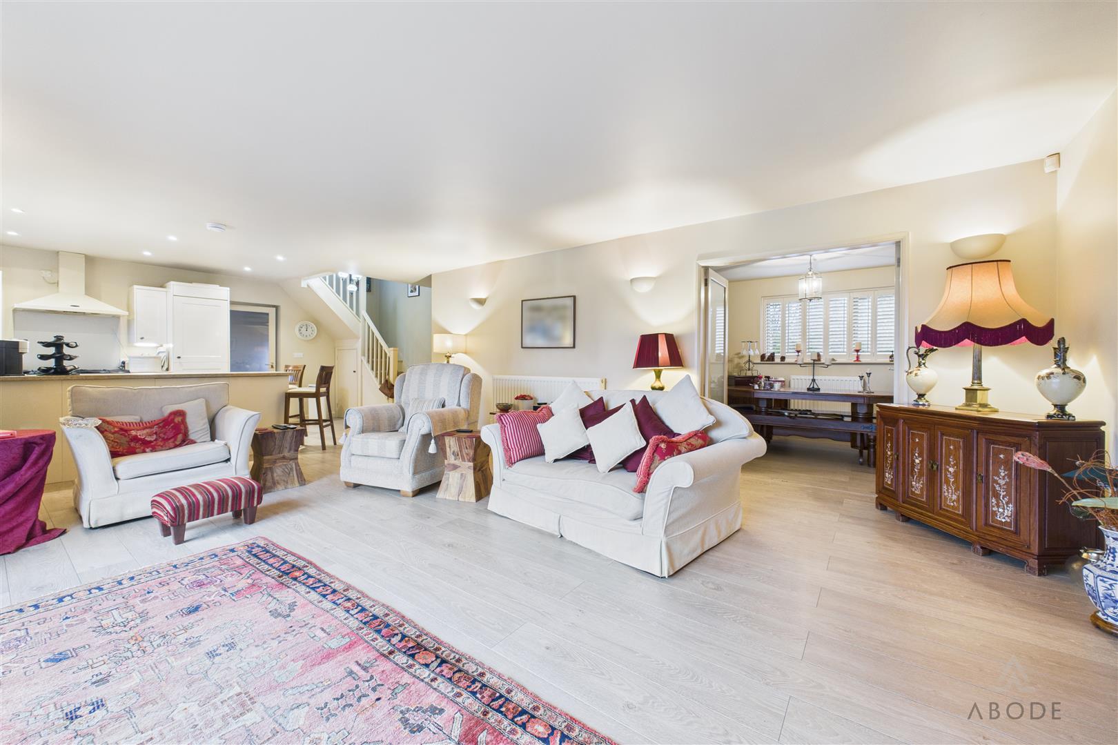 The kitchen area is a masterclass in modern country aesthetics, featuring crisp white shaker-style cabinetry accented by sleek black hardware. Culinary enthusiasts will appreciate the substantial range cooker and generous countertop space, while the integrated wine cooler and breakfast bar add a touch of luxury for social gatherings. A charming window fitted with classic white plantation shutters provides a pleasant outlook over the front of the property. Designed with versatility in mind, the expansive lounge area offers ample proportions for substantial furniture arrangements and flows naturally toward a secondary reception or formal dining room.
