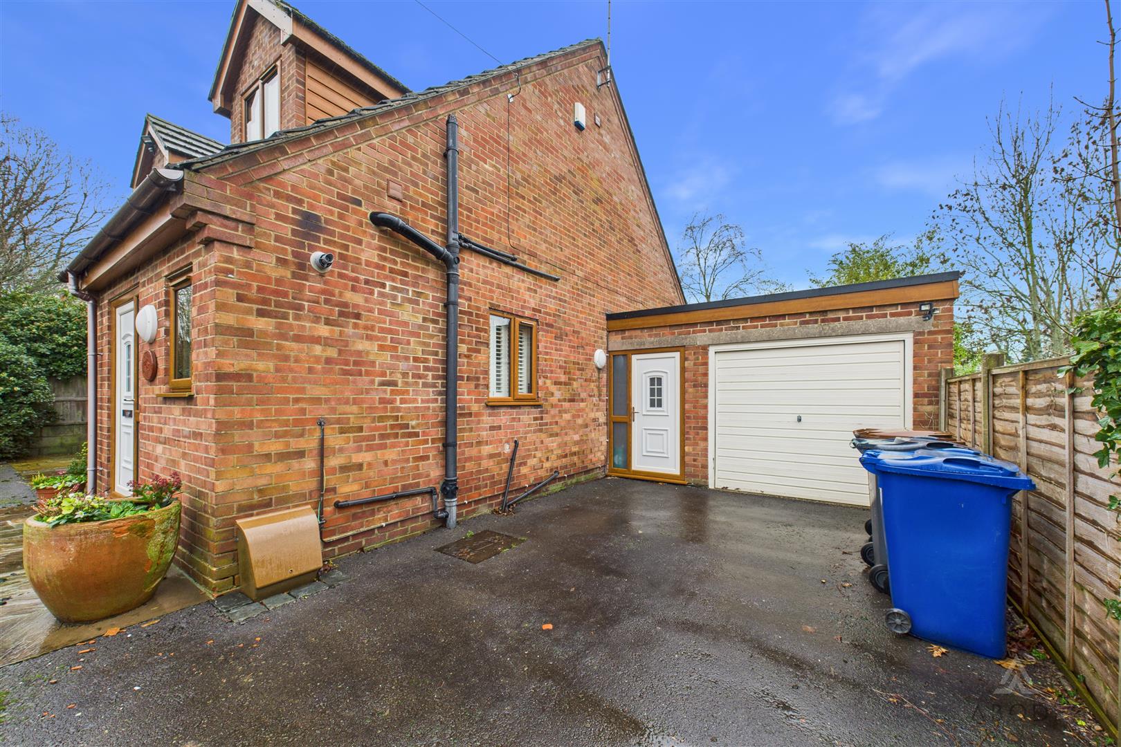 L-shaped garage featuring a UPVC double-glazed window to the rear elevation, up-and-over door to the front, housing the electrical consumer units and electric meter, with an internal door providing access to the rear garden.