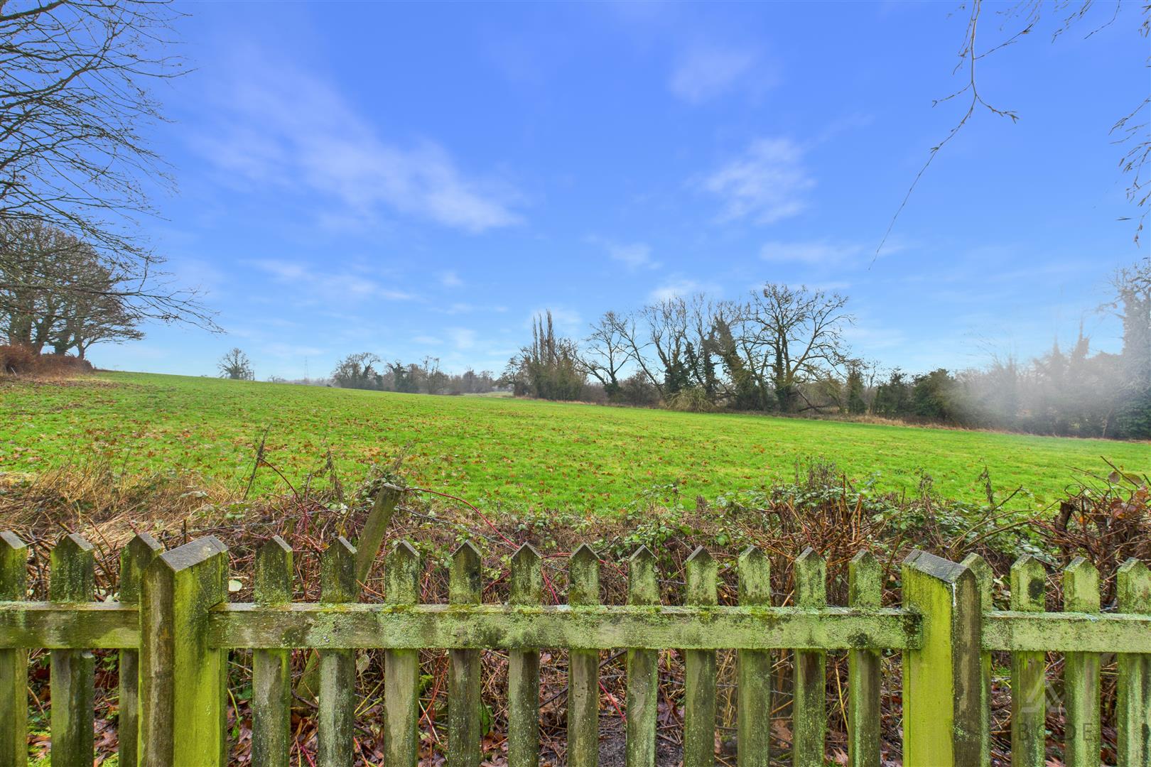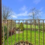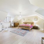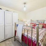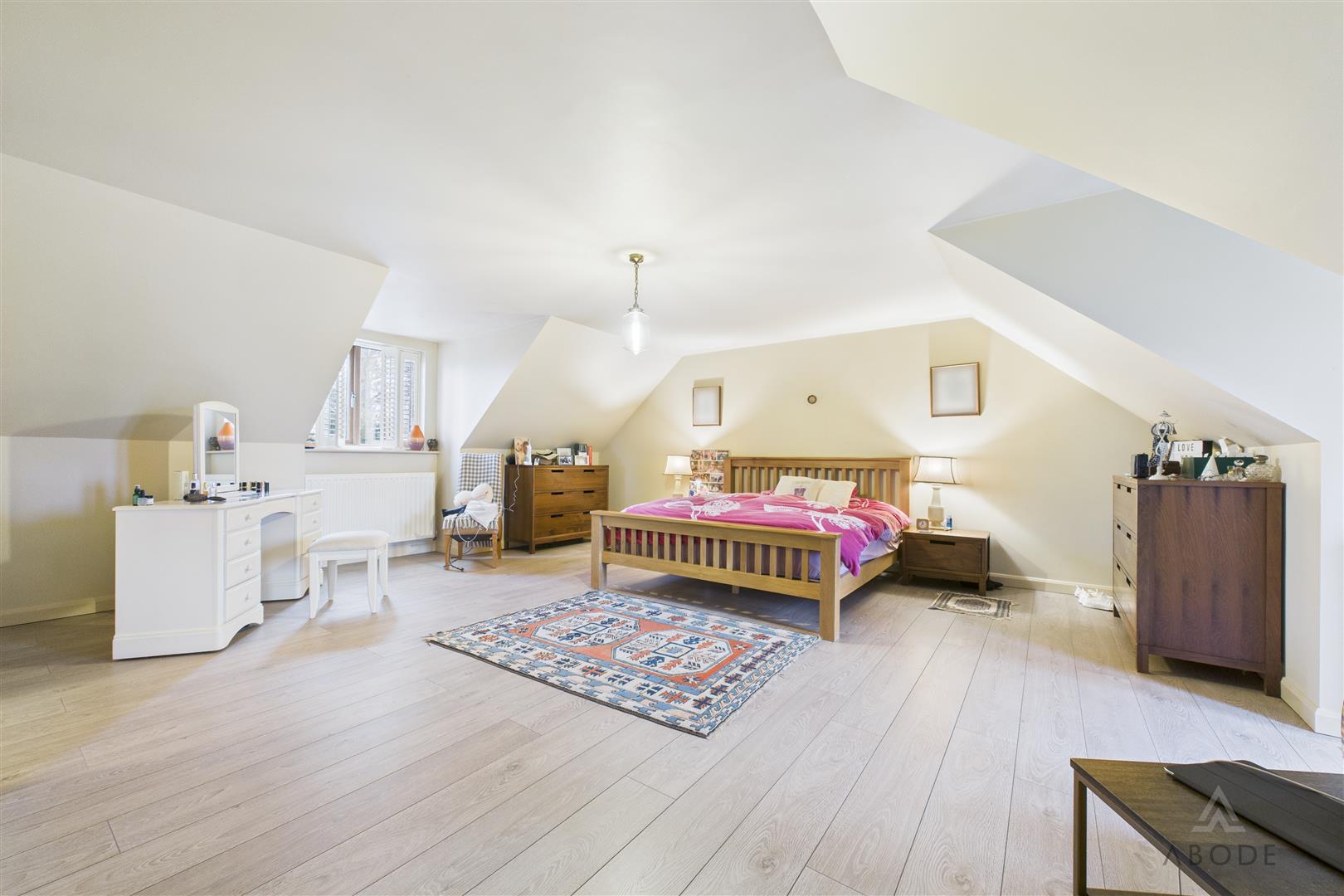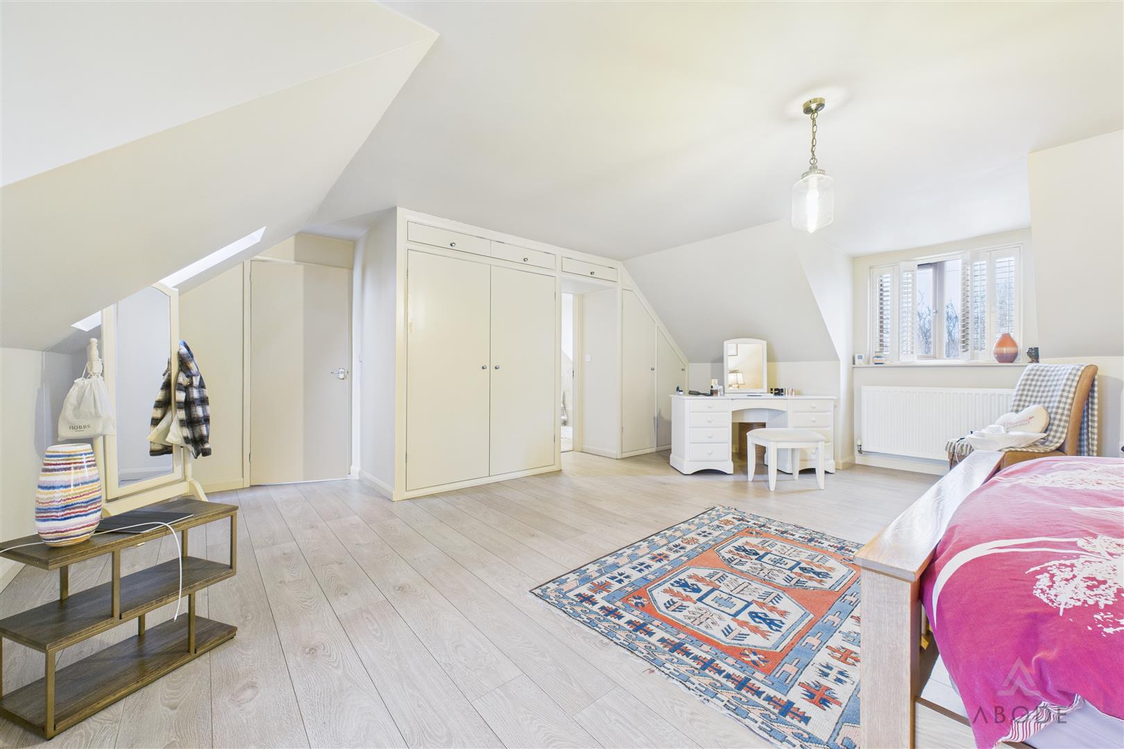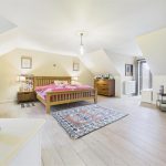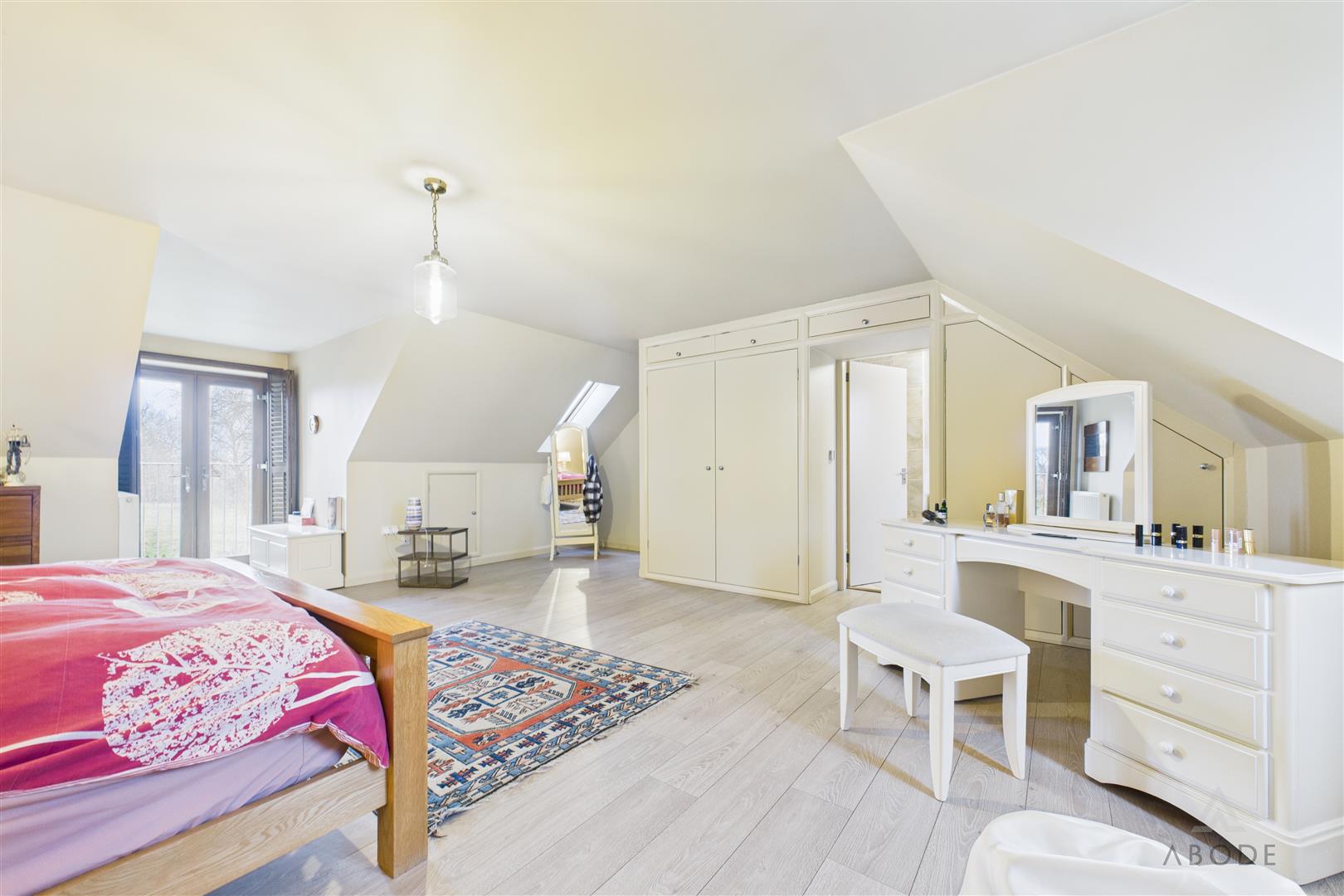 A spacious first-floor master bedroom featuring UPVC double-glazed French doors with Juliet balcony enjoying open rear views across agricultural land. Further benefits include built-in shutter blinds, an additional UPVC double-glazed front window, two central heating radiators, extensive built-in wardrobes with hanging rails and shelving, a rear Velux window, eaves storage, TV aerial point, and internal door to: