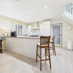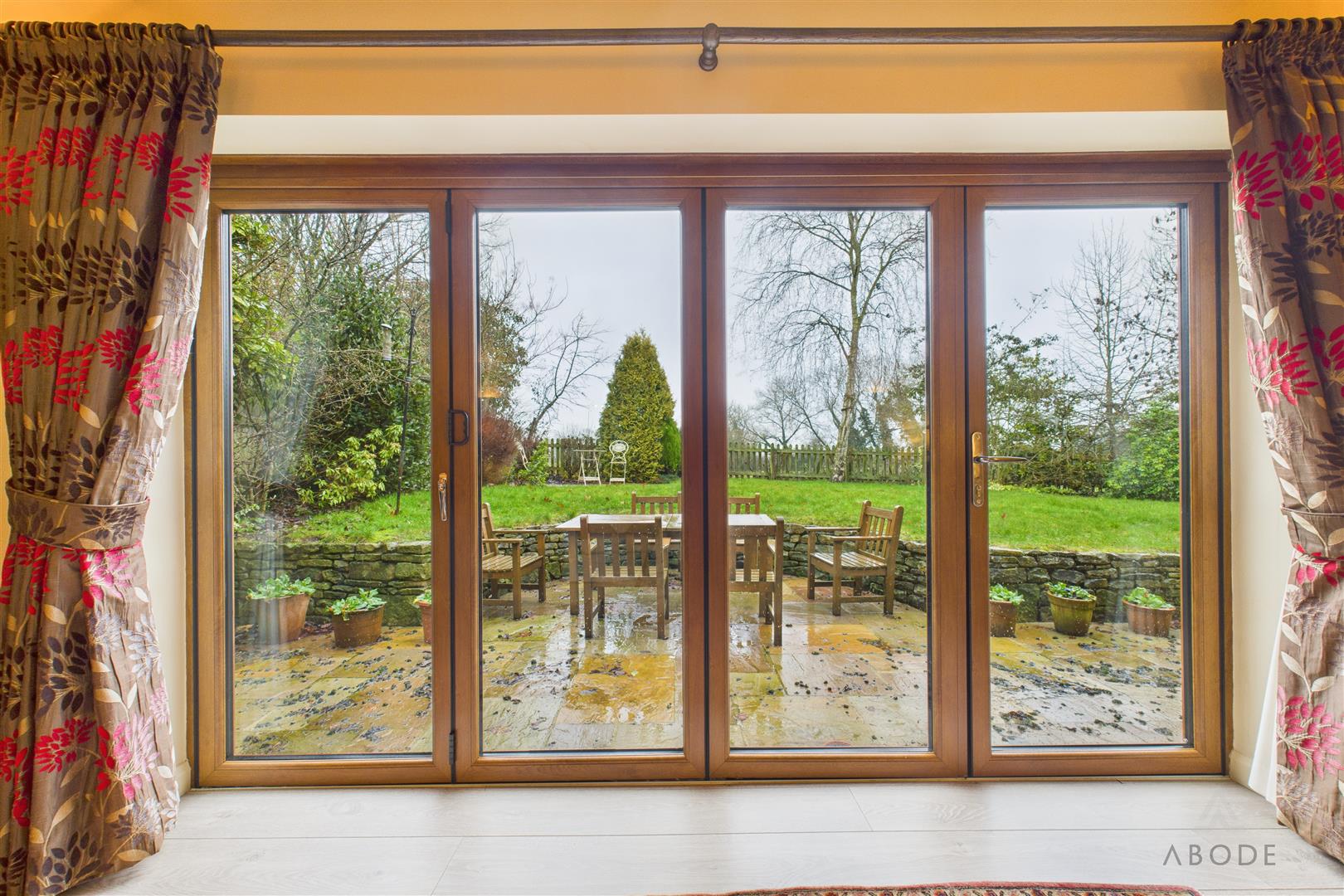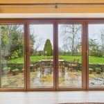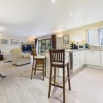 This impressive open-plan living space serves as the heart of the home, offering a seamless blend of contemporary style and functional design. Flooded with natural light from expansive floor-to-ceiling bi-fold doors, the room transitions effortlessly from the interior to a private patio and garden, making it an ideal setting for both relaxed family life and large-scale entertaining. The entire area is tied together by elegant light-wood flooring and a sophisticated lighting scheme that combines recessed spotlights with warm wall-mounted uplights.
