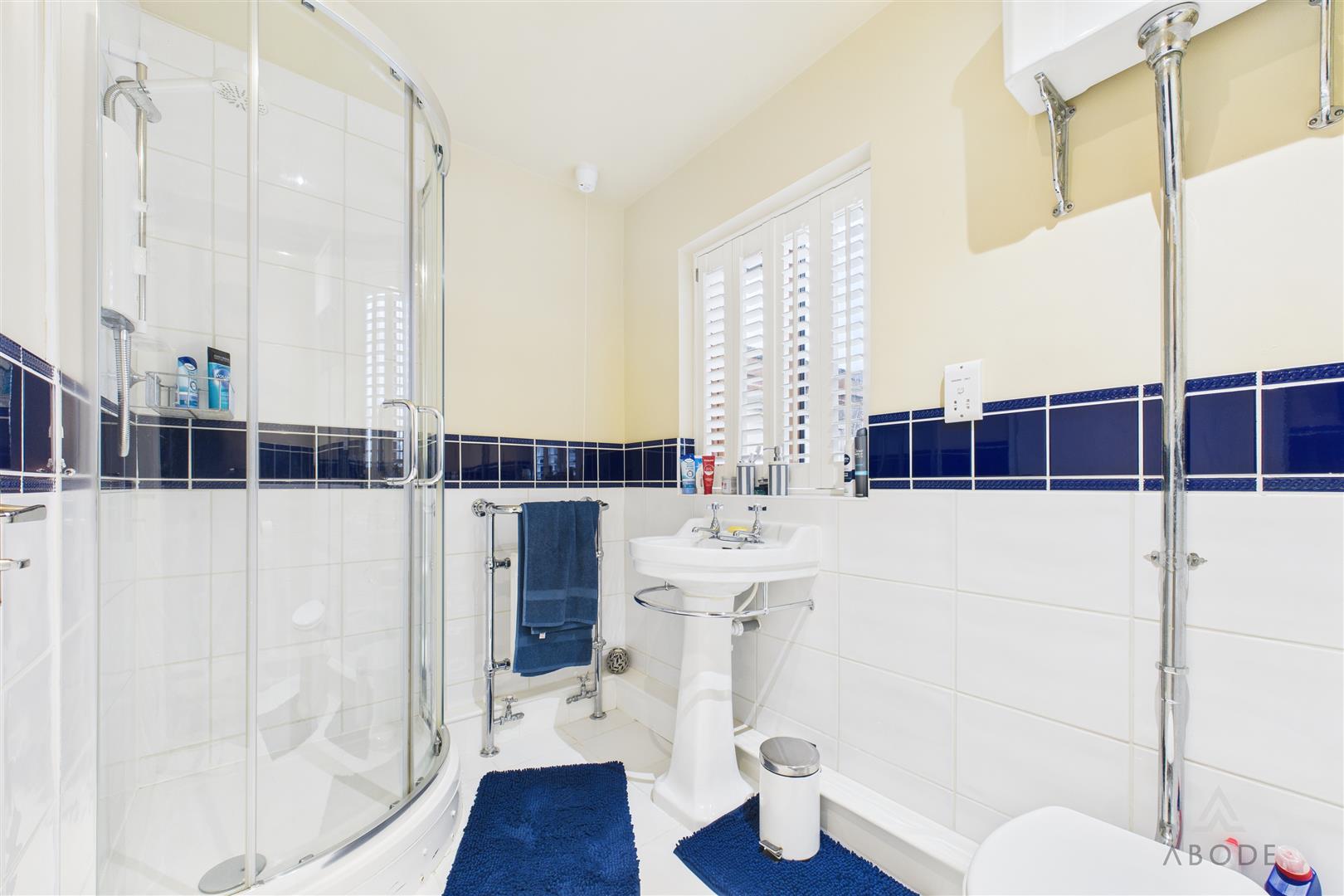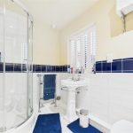 With a UPVC double-glazed window to the side elevation with built-in shutter blinds. Three-piece suite comprising high-level WC, pedestal wash basin with chrome mixer tap, and corner shower cubicle with electric shower. Additional features include ceiling spotlighting, shaving point, loft access, and a Milano Windsor heated towel rail.