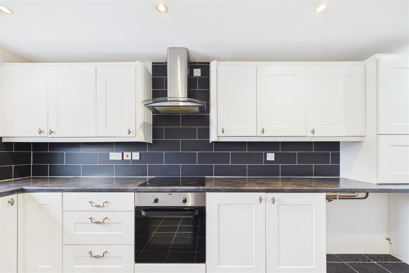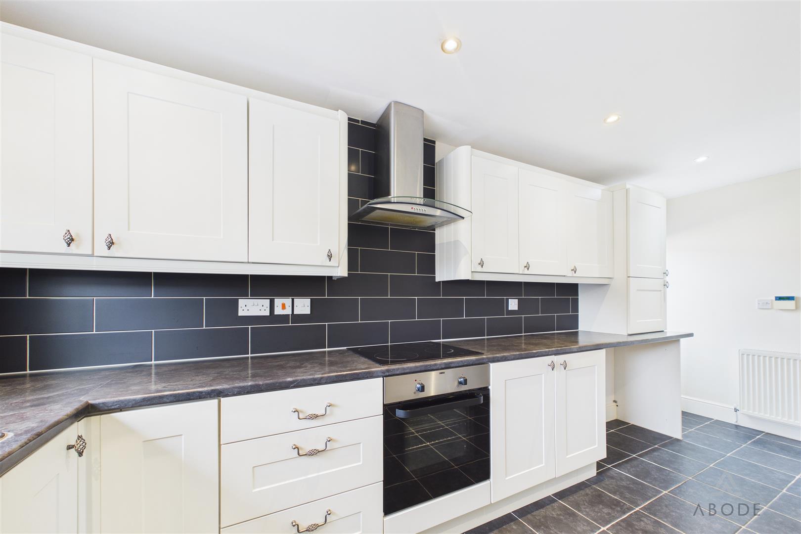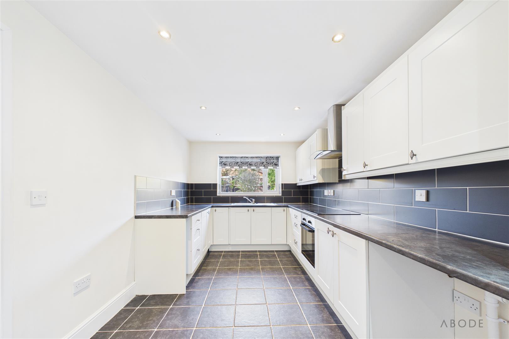The extended kitchen is well fitted with a range of wall and base units, incorporating an integrated oven and hob, with further space for appliances. A window overlooks the garden, and there is a side access door.