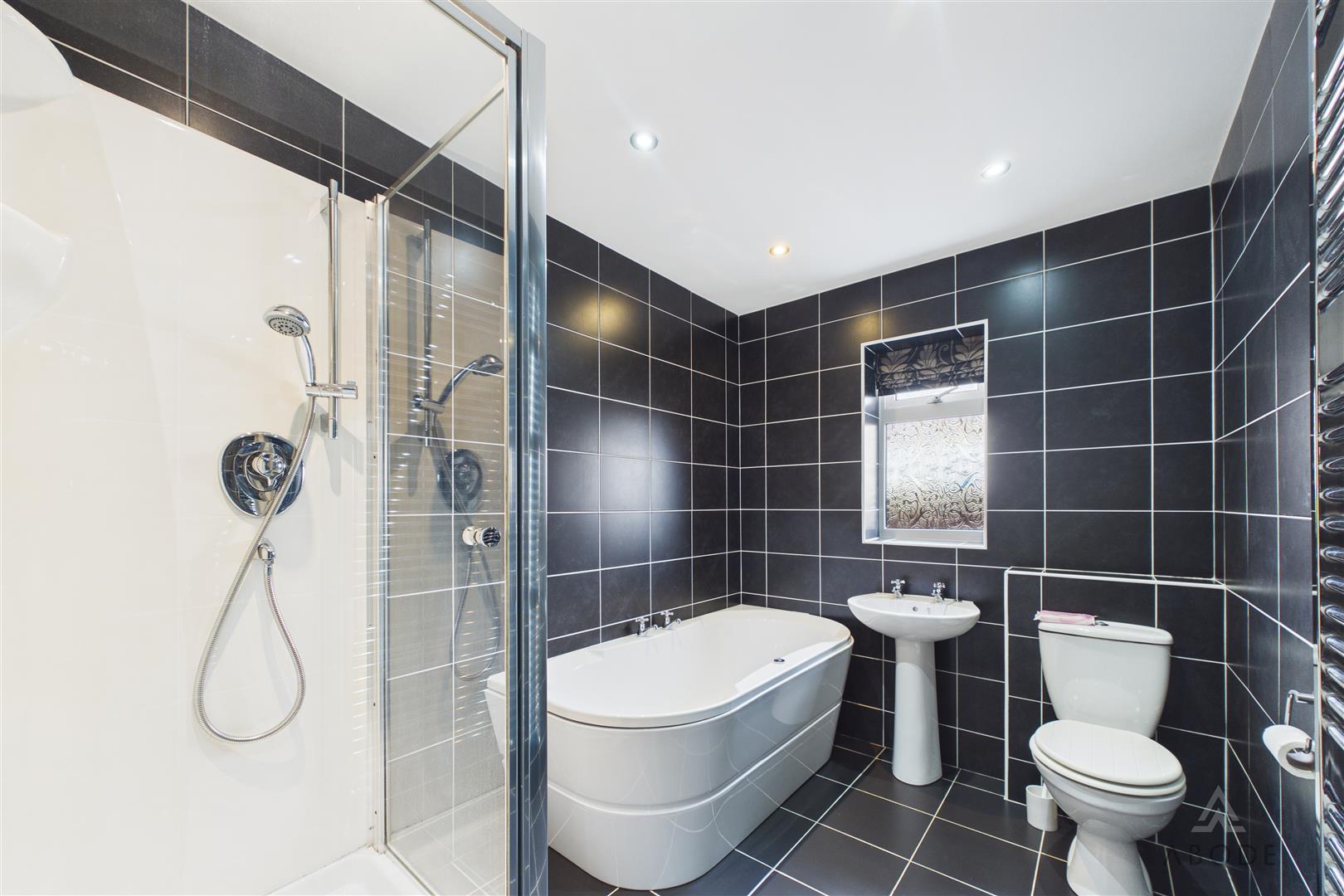 The bathroom is fitted with a four-piece suite, comprising a bath, separate shower cubicle, wash hand basin, low-level WC, and a heated towel rail.