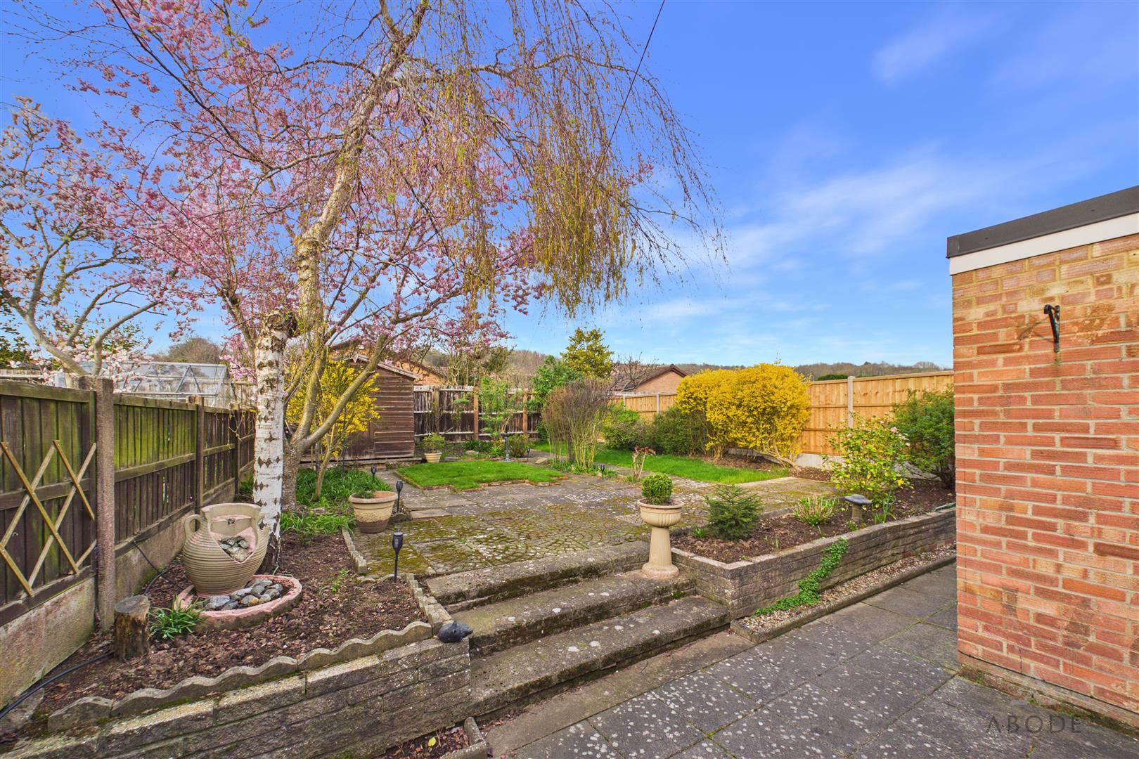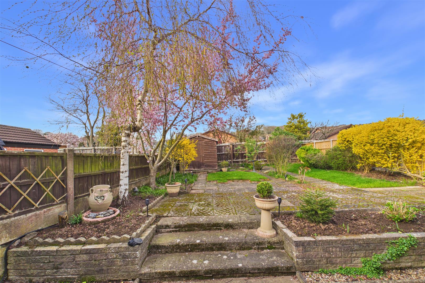 The rear garden has been well maintained and features a paved patio area, shaped lawn, and a variety of established borders, creating a pleasant outdoor space.