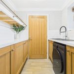 With a double glazed window to the front elevation, the utility room provides a further range of matching base-level storage cupboards with drop-edge work surfaces and complementary tiling. Integrated appliances include a composite one-and-a-half sink and drainer with spray mixer tap, along with plumbing and space for freestanding under-counter white goods. Coving to the ceiling, extractor fan and an internal door lead through to the: