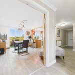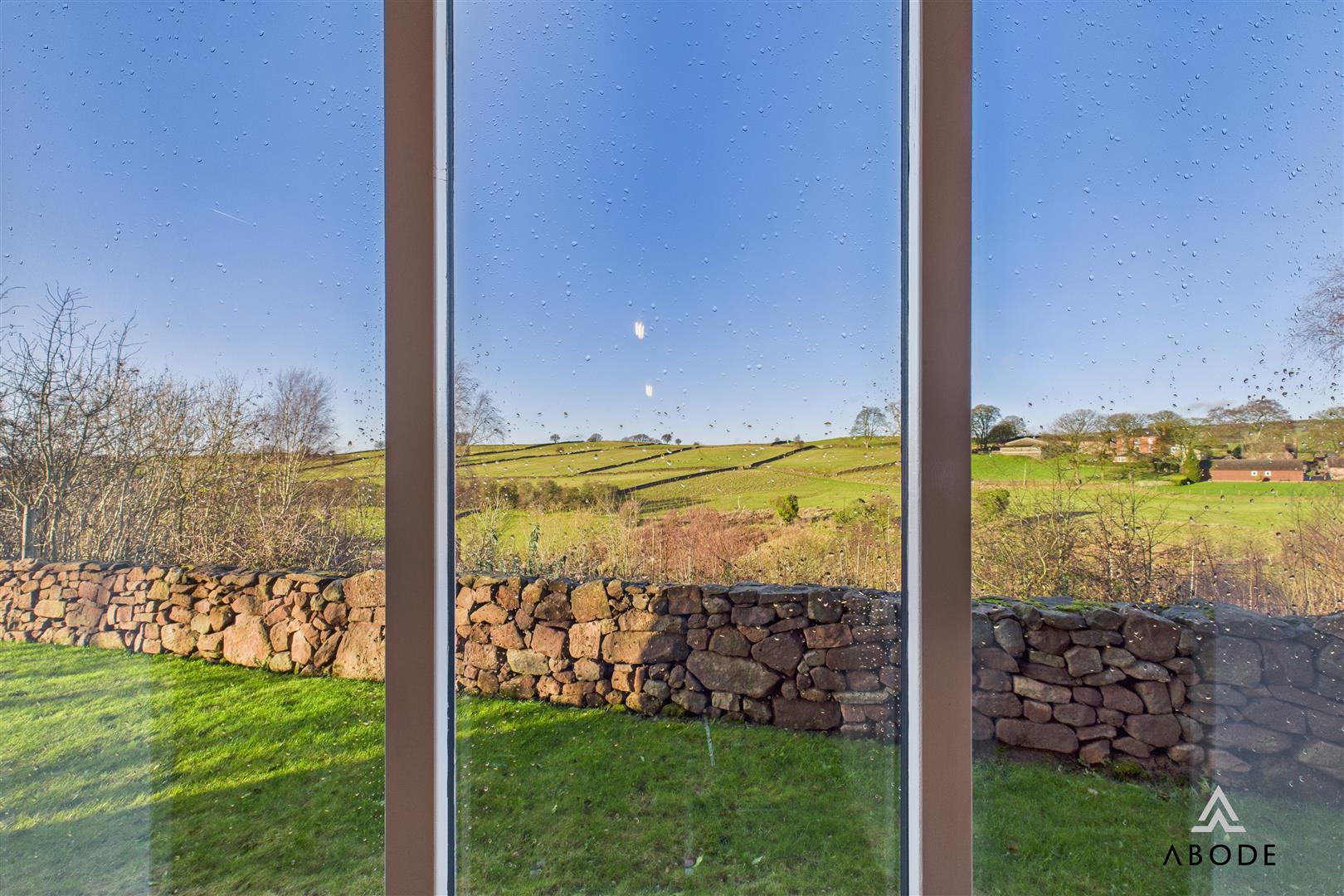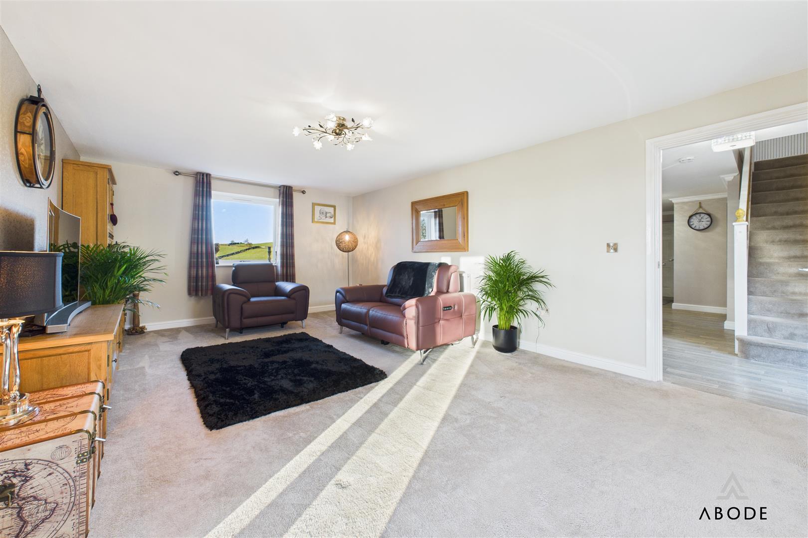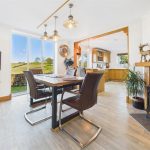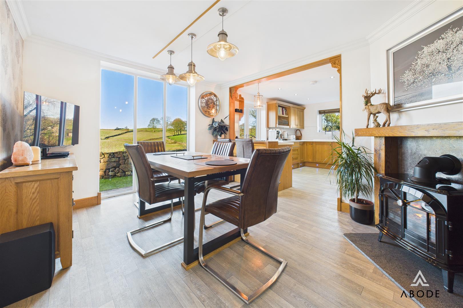 The adjoining dining space enjoys far-reaching countryside views through an oversized double glazed window to the side elevation, and features a central heating radiator, coving to the ceiling, electric log-burner-style focal point and internal doors connecting to additional accommodation.