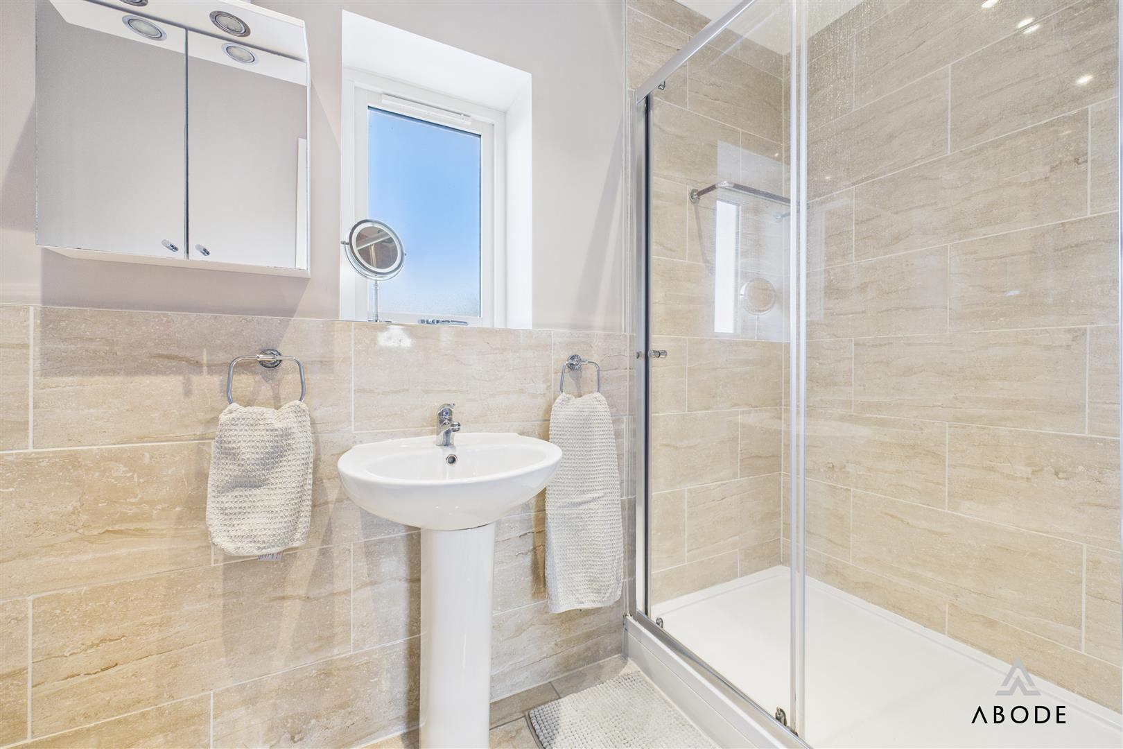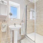 A further stylish shower room with a double glazed frosted window to the front elevation. The suite includes a low-level WC with continental flush, pedestal wash hand basin with mixer tap and a double shower cubicle with sliding glass screen and waterfall showerhead. Complementary wall and floor tiling, a chrome heated towel radiator, extractor fan, coving and ceiling spotlighting are also featured.