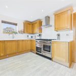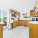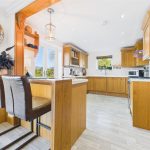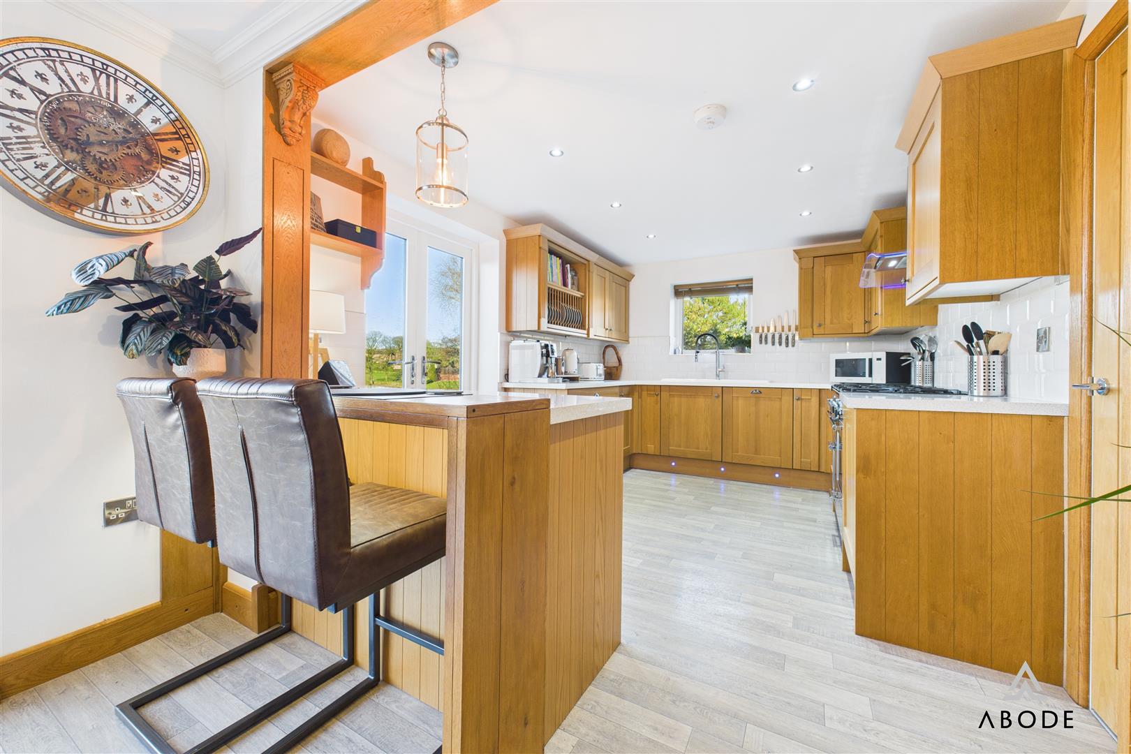 This impressive open-plan kitchen diner features a double glazed window to the front elevation and double glazed French doors opening to the side, creating a bright and welcoming environment. The kitchen is fitted with a bespoke range of matching oak storage cupboards, drawers and display units paired with drop-edge preparation surfaces and complementary tiling. Integrated appliances include a ceramic one-and-a-half sink and drainer with spray mixer tap, a focal six-ring Rangemaster cooker with double electric ovens and matching extractor hood, a dishwasher, integrated freezer and integrated double fridge. A breakfast bar and ceiling spotlighting complete the kitchen area.
