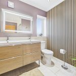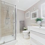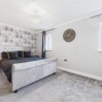 This modern en suite features a double glazed frosted window to the side elevation and a stylish three-piece suite comprising a low-level WC with continental flush, his-and-hers sink units with mixer taps, base-level drawers and tiled splashbacks. A double shower cubicle with chrome waterfall showerhead, sliding glass screen and complementary floor-to-ceiling tiling is the centrepiece. Acoustic feature wall panelling, a chrome heated towel radiator, coving, extractor fan and ceiling spotlighting add to the luxurious finish.
