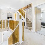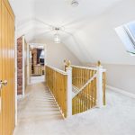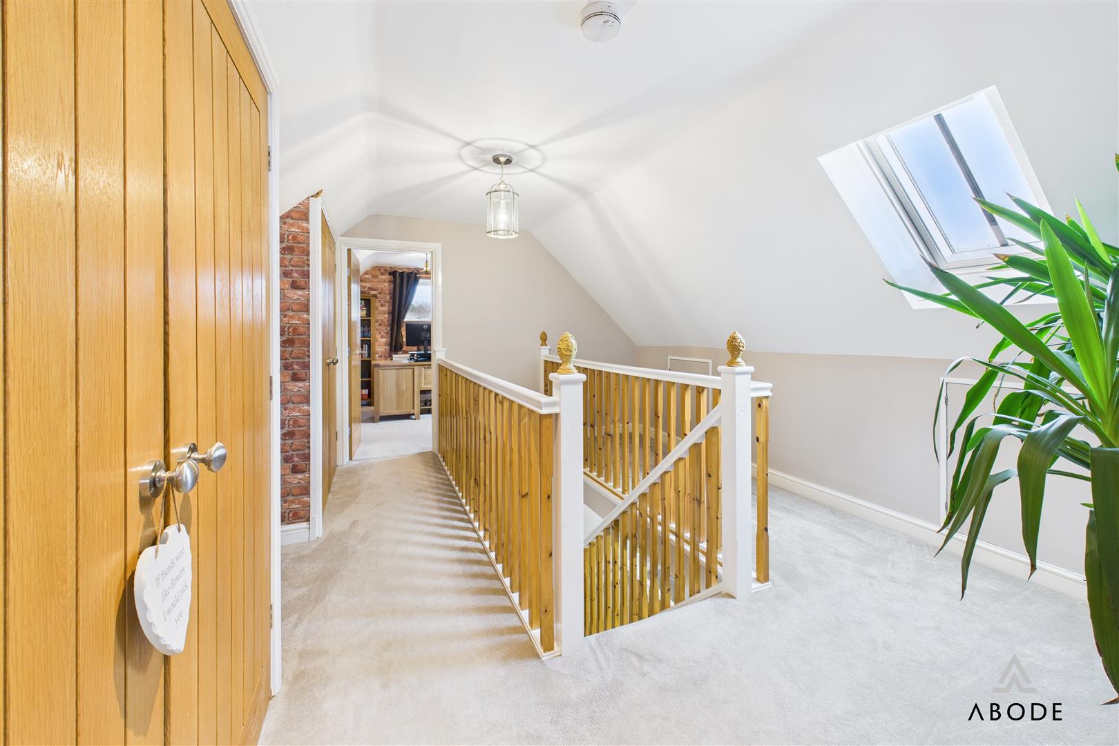 The upper landing features a double glazed Velux window to the ceiling, built-in eaves storage and two double storage cupboards fitted with hanging rails for practical use. A smoke alarm, ceiling spotlighting and internal doors lead to the top-floor bedrooms.