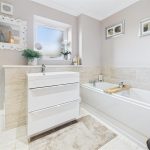 A double glazed frosted window to the side elevation provides natural light to this neatly appointed cloakroom, fitted with a low-level WC with continental flush, pedestal wash hand basin with mixer tap and tiled splashback. The space is completed with a central heating radiator, ceiling spotlighting and extractor fan.