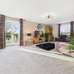 A bright and spacious living room featuring large windows and French doors that fill the space with natural light and offer attractive countryside views. French doors open onto the patio, enhancing indoor–outdoor living. Neutral décor and quality carpeting create a warm, modern feel, making this an ideal space for relaxing or entertaining.