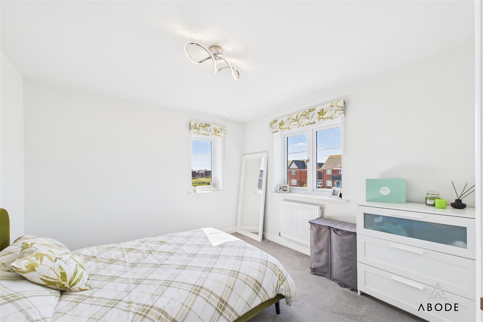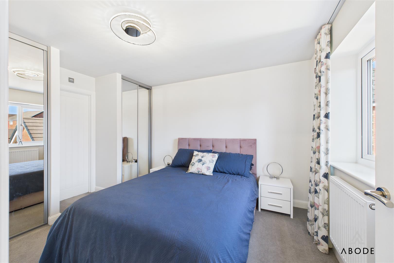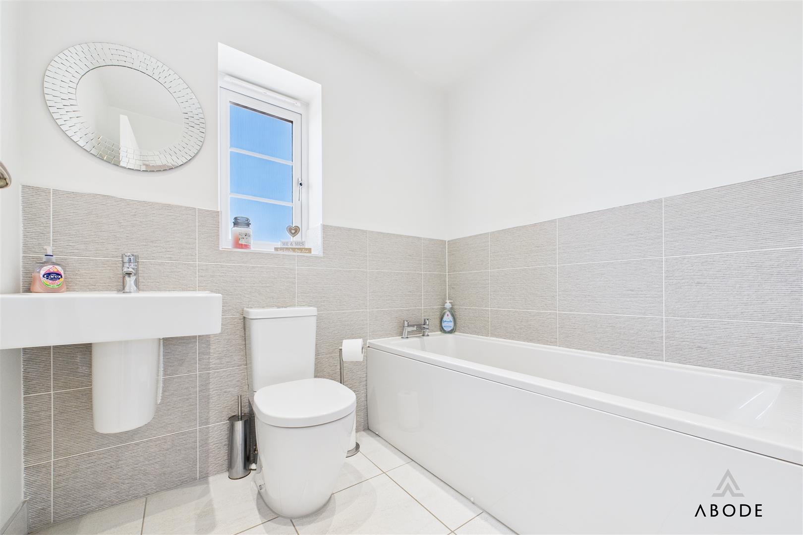 To the first floor, a spacious landing gives access to three bedrooms and the family bathroom. The principal bedroom benefits from fitted mirrored wardrobes and a modern en-suite shower room with tiled walls and a double shower enclosure. The second bedroom is a generous double room with dual aspect windows offering pleasant views over the front, while the third bedroom is currently used as a nursery but would make an ideal child’s room or home office. The family bathroom is fitted with a white three-piece suite, featuring part tiled walls and a window to the rear.