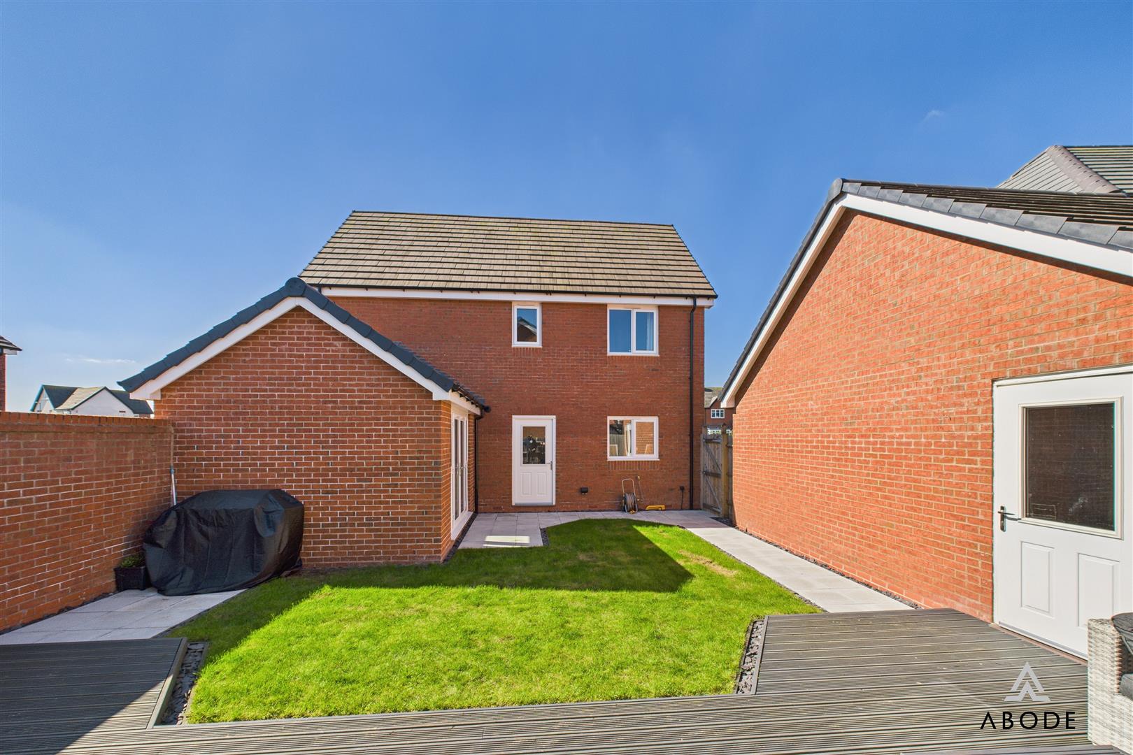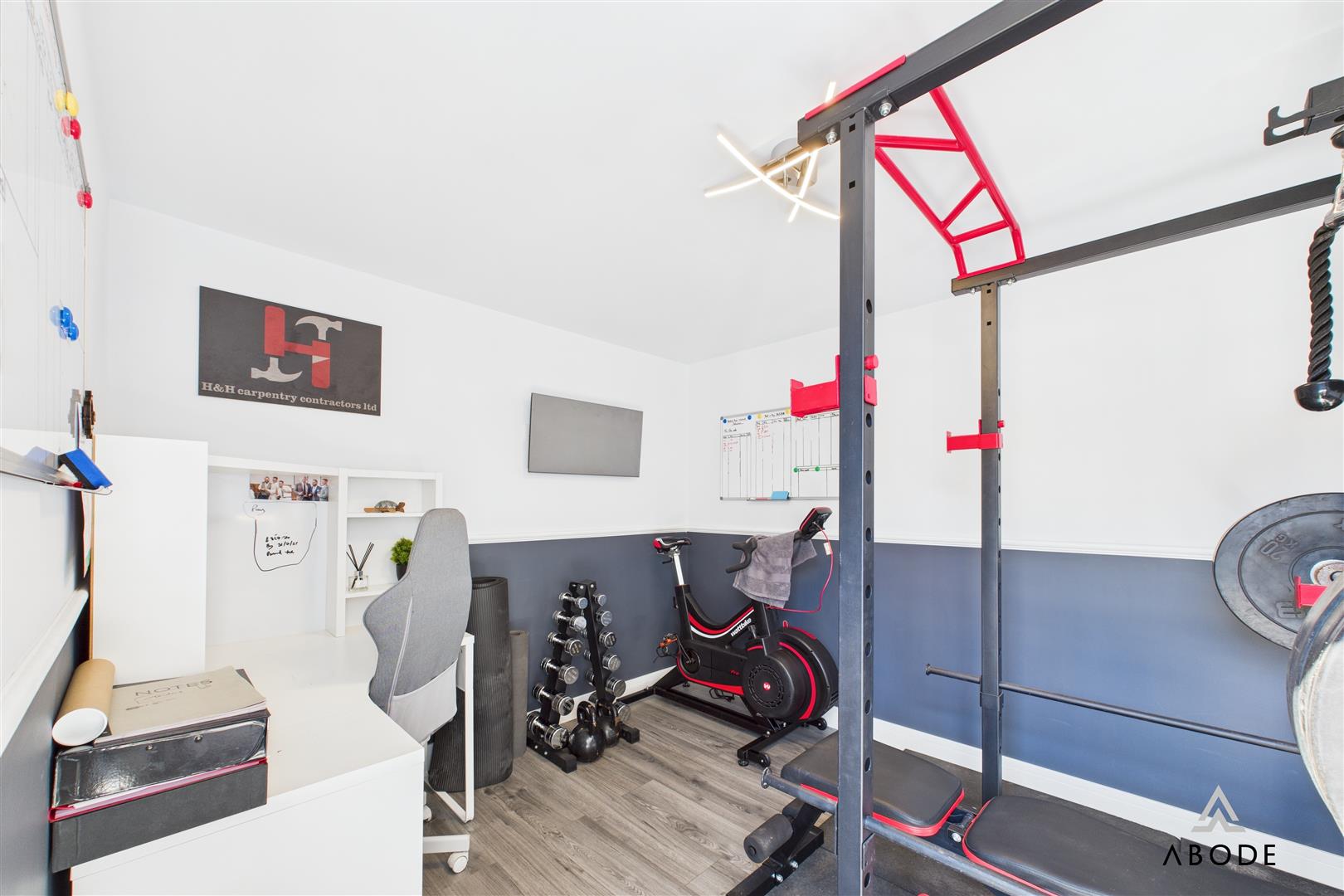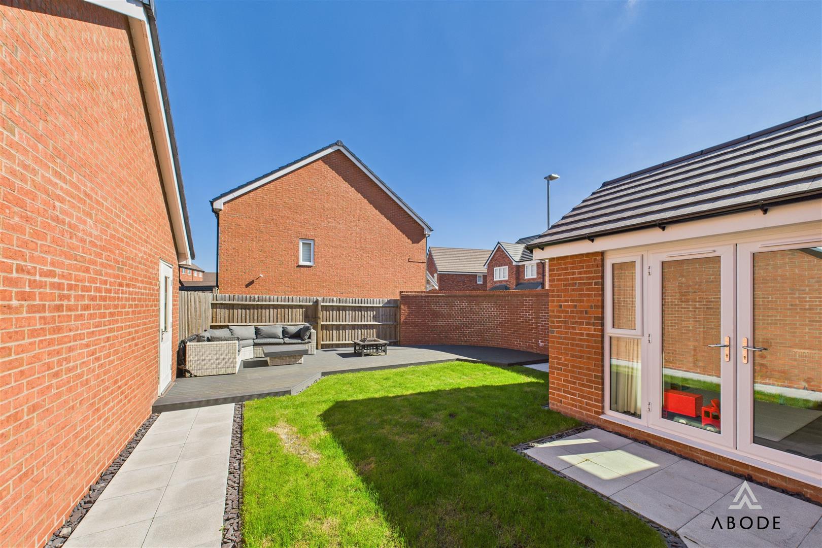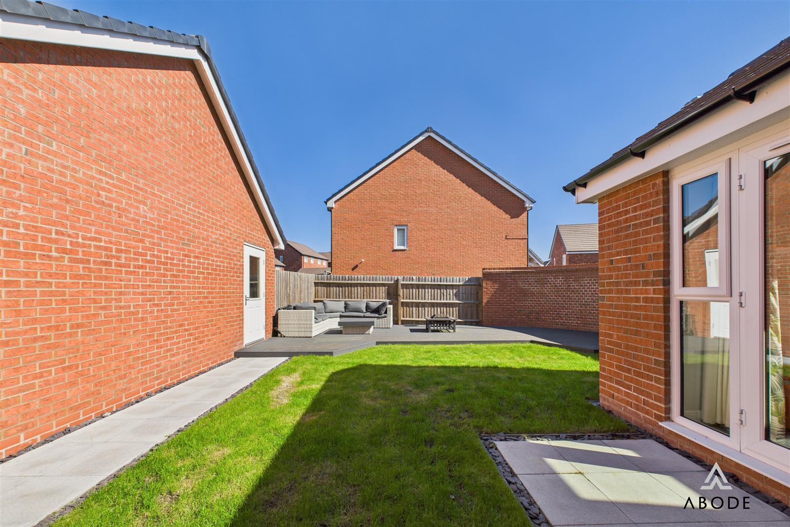 Outside, the property continues to impress. The front elevation offers kerb appeal with its neat landscaping, tarmac driveway, and detached garage. The garage has been partially converted to create a versatile gym space with lighting and flooring, while the front portion remains useful for storage. The enclosed rear garden is beautifully landscaped with a central lawn, surrounding pathways, and two distinct decked seating areas – ideal for relaxing or entertaining on warmer days.