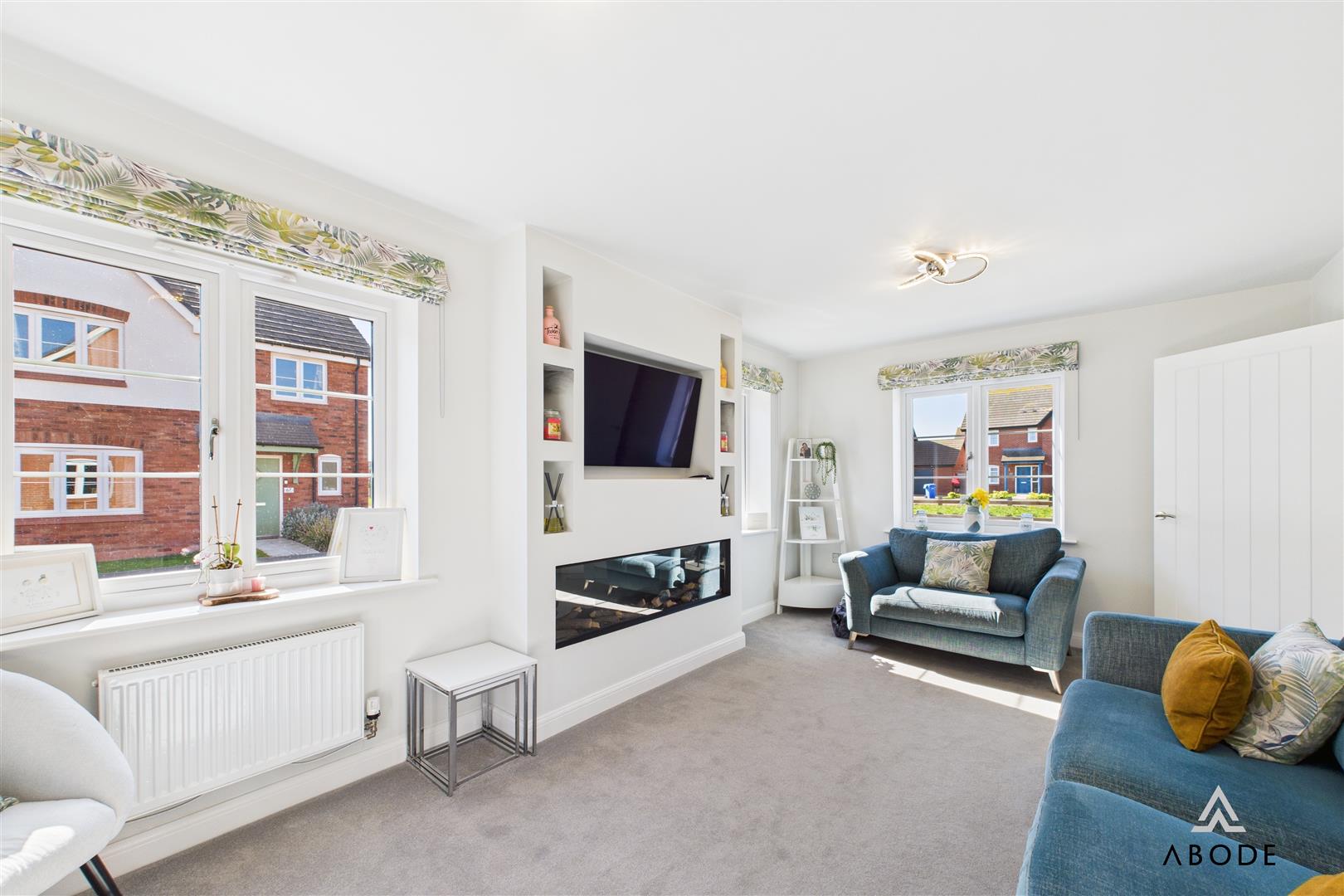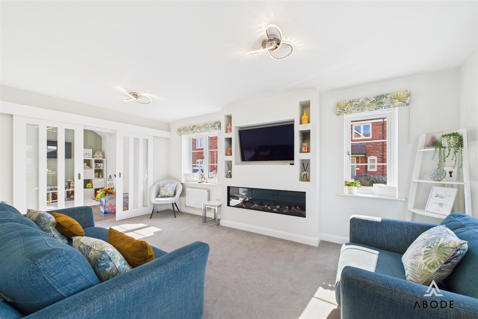 Internally, the property has been thoughtfully extended and upgraded, and opens via a front entrance door into a welcoming hallway with stairs rising to the first floor and doors leading off to the living room, kitchen diner, and WC. The living room is an inviting space and features a bespoke media wall with a built-in electric fire, a TV recess, and fitted shelving – ideal for relaxing and entertaining. An opening flows through to the extended playroom/snug at the rear, which is bathed in natural light from the double glazed French doors opening onto the patio and garden beyond.
