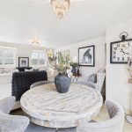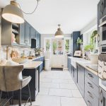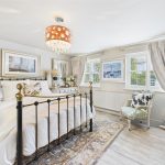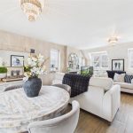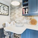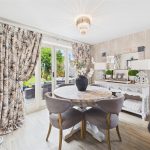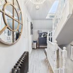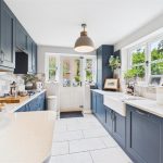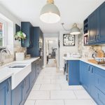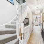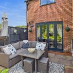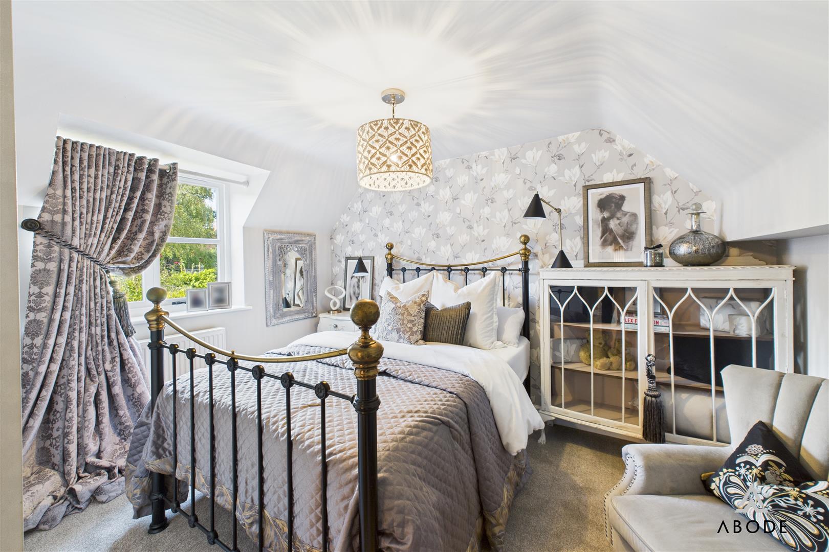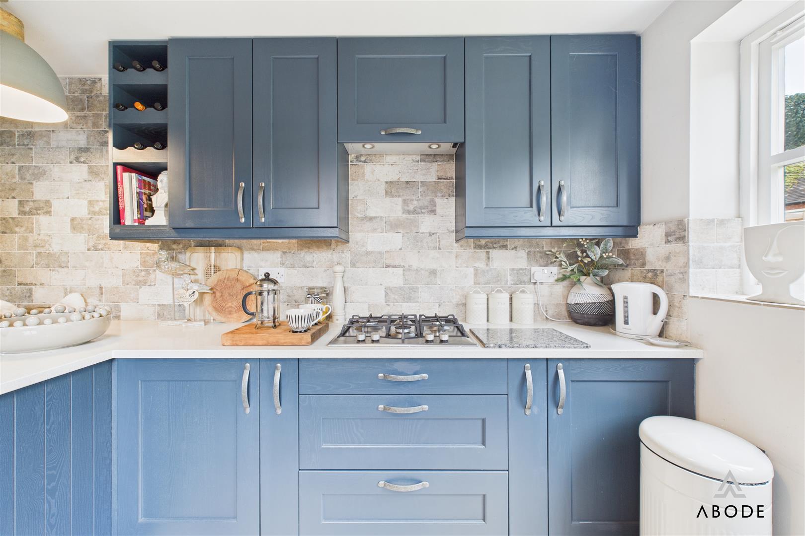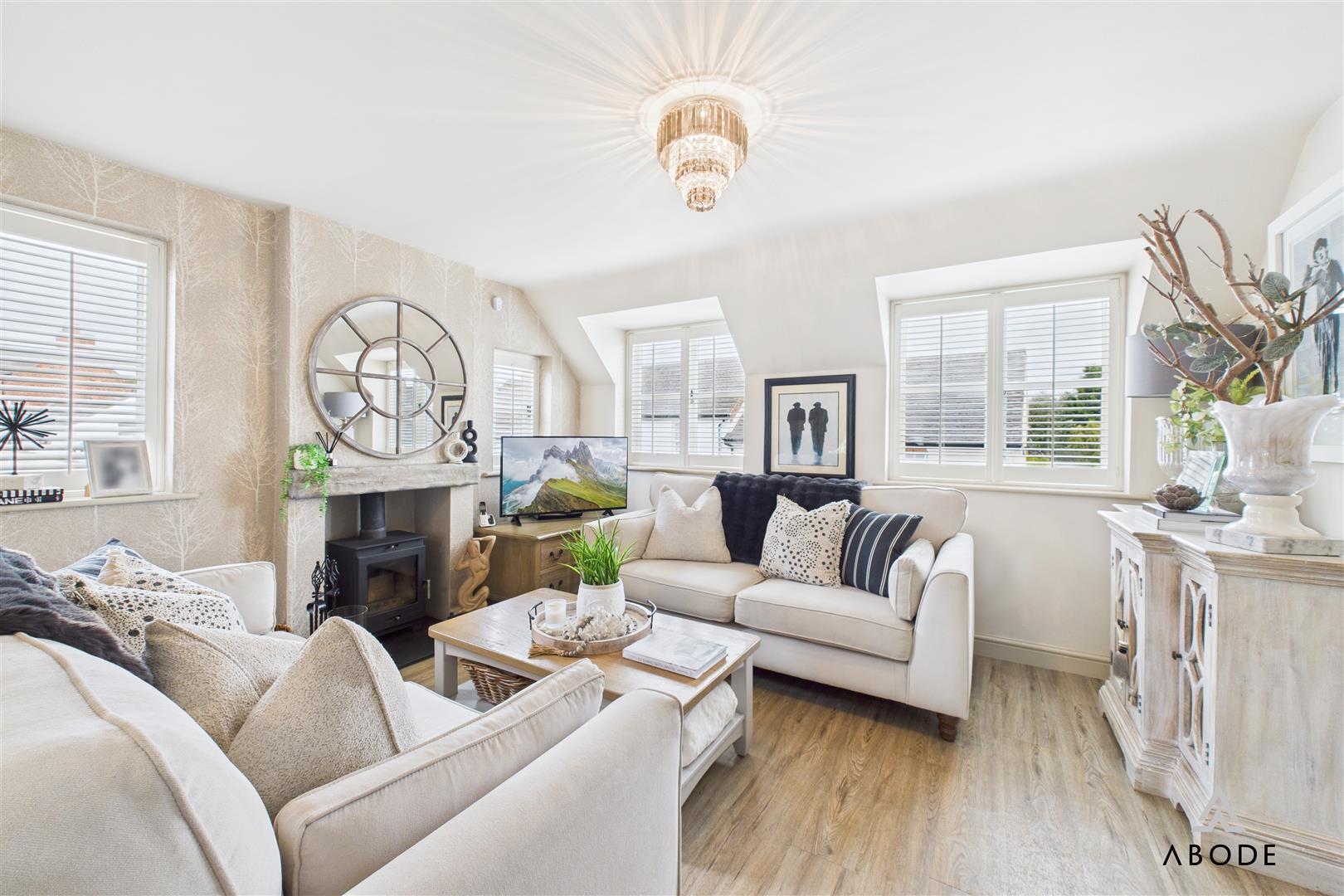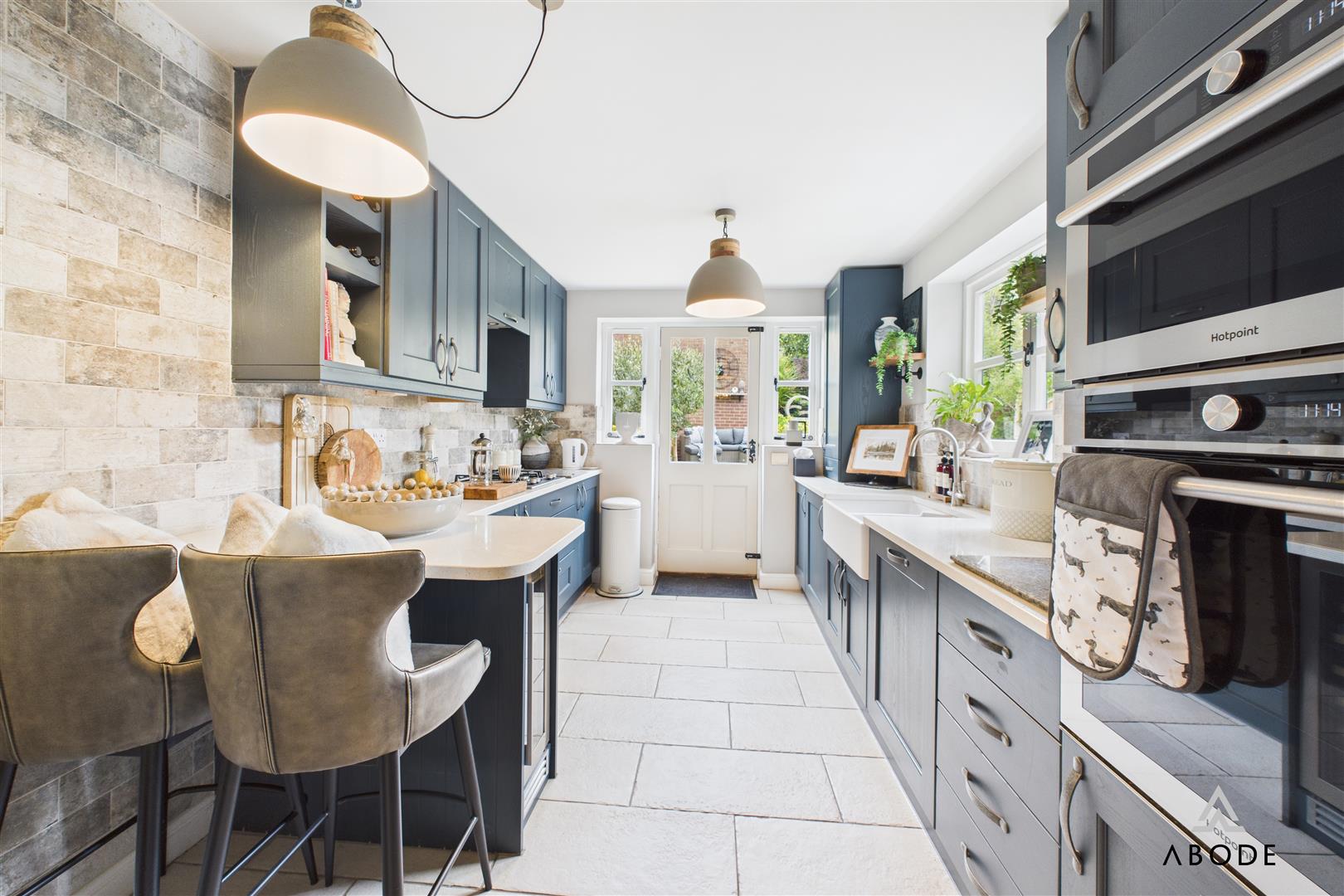 The first-floor landing is broad enough to create a useful study/reading nook and leads to the main living spaces. The shaker-style kitchen is fitted with deep blue cabinetry and marble work surfaces, a Belfast sink, integrated double ovens, a five-burner gas hob, wine cooler and breakfast bar seating; a door opens directly to the garden. The lounge diner offers excellent space for both relaxing and entertaining, with a log burning stove focal point, dual windows to the front and French doors opening to the patio and gardens. A stylish WC/cloaks completes this level.