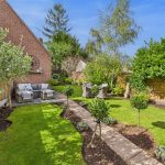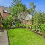 To the front the home sits behind wrought-iron railings with a well-kept fore-garden and a side gate through to the rear. A private driveway to the side provides off-street parking and leads to a single garage. The rear garden is a real feature: professionally landscaped with shaped lawns, established planting, and multiple seating zones including a patio by the French doors and further terrace areas—perfect for alfresco dining and summer evenings.