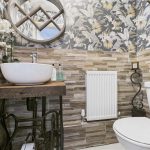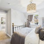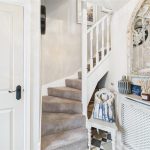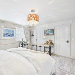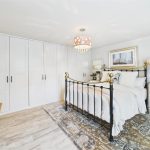 A welcoming hallway with patterned tiled flooring sets the tone, with staircase rising to the first floor. The master bedroom is a well-proportioned double featuring a bank of fitted wardrobes and a front window with shutters. It is served by a private en-suite finished in contemporary tiling, with a glazed shower enclosure, vanity wash basin and WC.