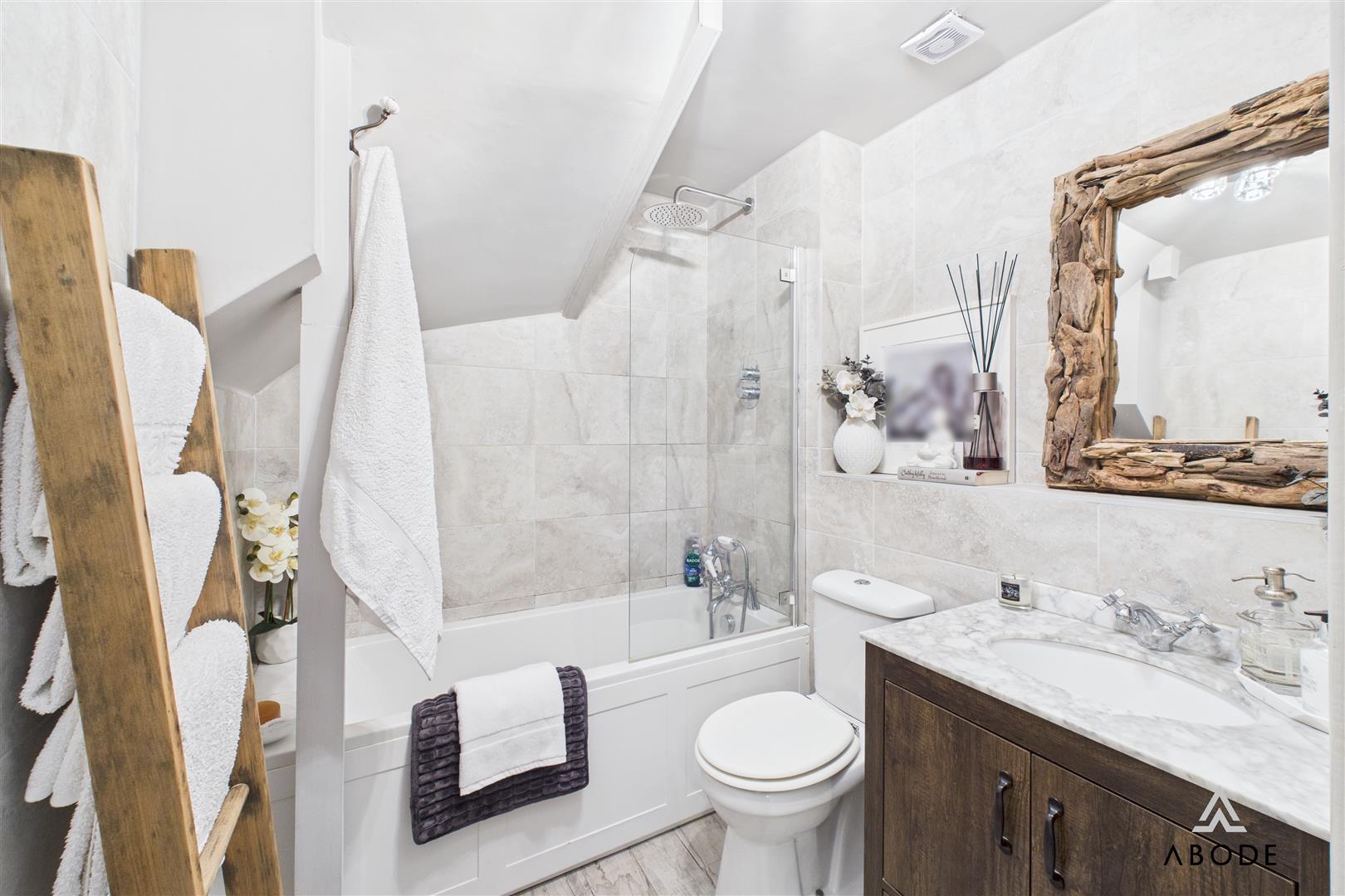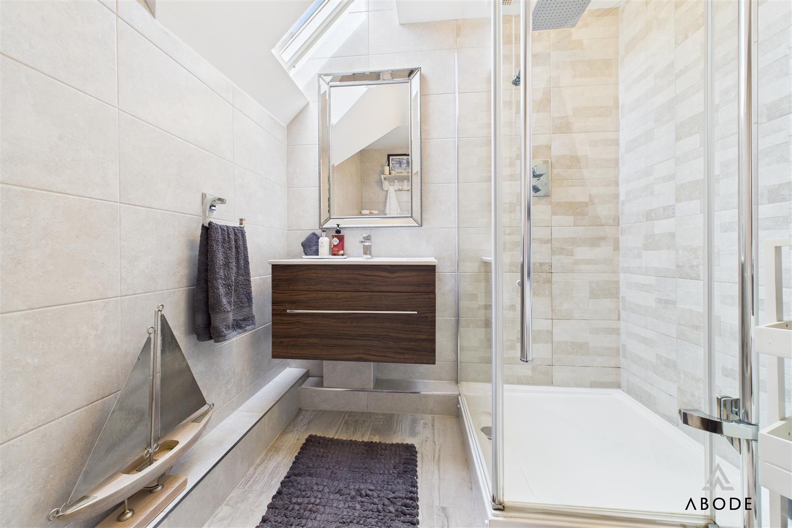 The top floor provides two further bedrooms, each with character ceiling lines and good natural light, served by the main shower room fitted with a vanity unit, WC and a shower enclosure.