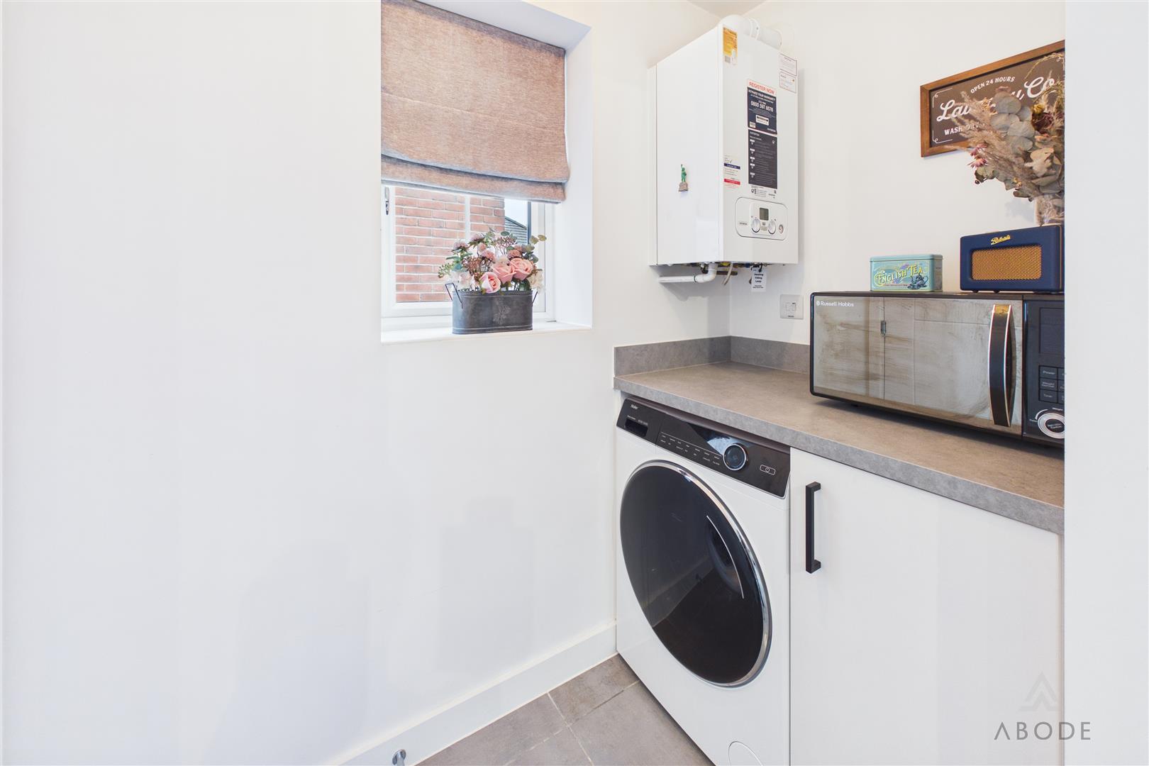 Plumbing and space for a washing machine, work surface and cupboard, wall mounted boiler and upvc double glazed window.