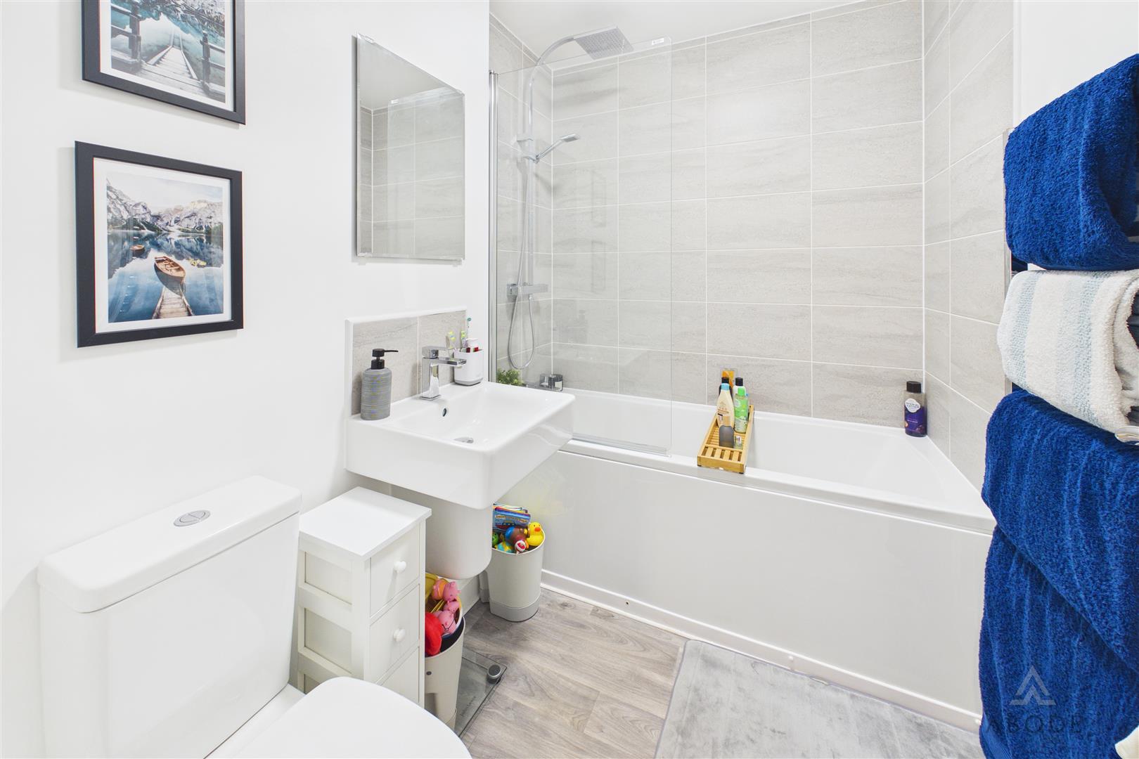 Panel encloed bath, low flush wc, wash hand basin and a radiator.